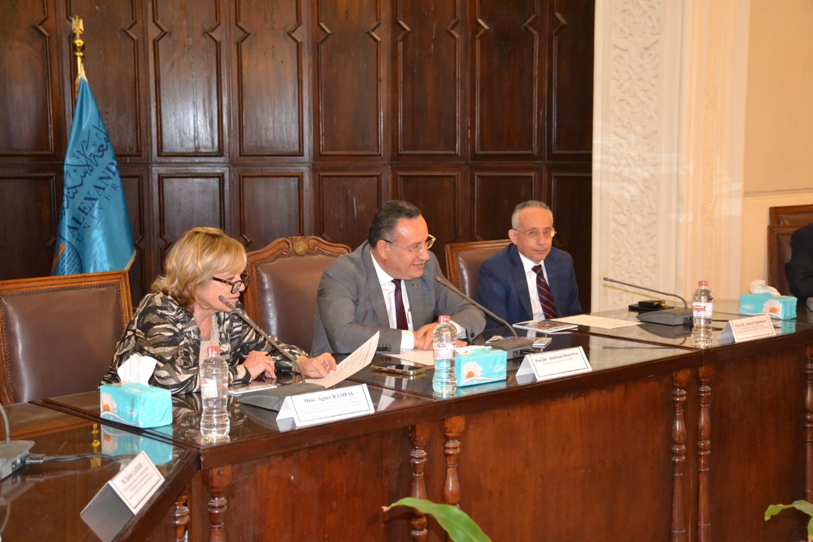 وفي كلمته رحب رئيس جامعة الإسكندرية، بالوفد الفرنسي في رحاب جامعة الإسكندرية، مشيرًا إلى العلاقات الممتدة بين الجانبين من خلال التعاون الأكاديمي والدرجات العلمية المشتركة مع العديد من الجامعات الفرنسية، فى إكس مارسيليا، وبواتييه، وبوردو، وتولوز، وجرونوبل بفرنسا، لافتًا إلى تميز جامعة الإسكندرية بوجود أقسام خاصة باللغة الفرنسية في عدة كليات والتي تتعاون بحثيا مع الجامعات الفرنسية، ولديها فرع بدولة تشاد في الدول الناطقة باللغة الفرنسية (الفرانكفونية) بقارة أفريقيا.