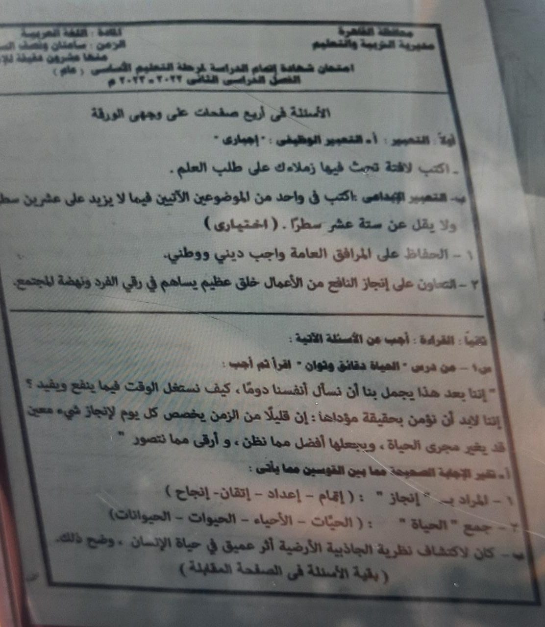 تسريب امتحان اللغة العربية للشهادة الإعدادية القاهرة