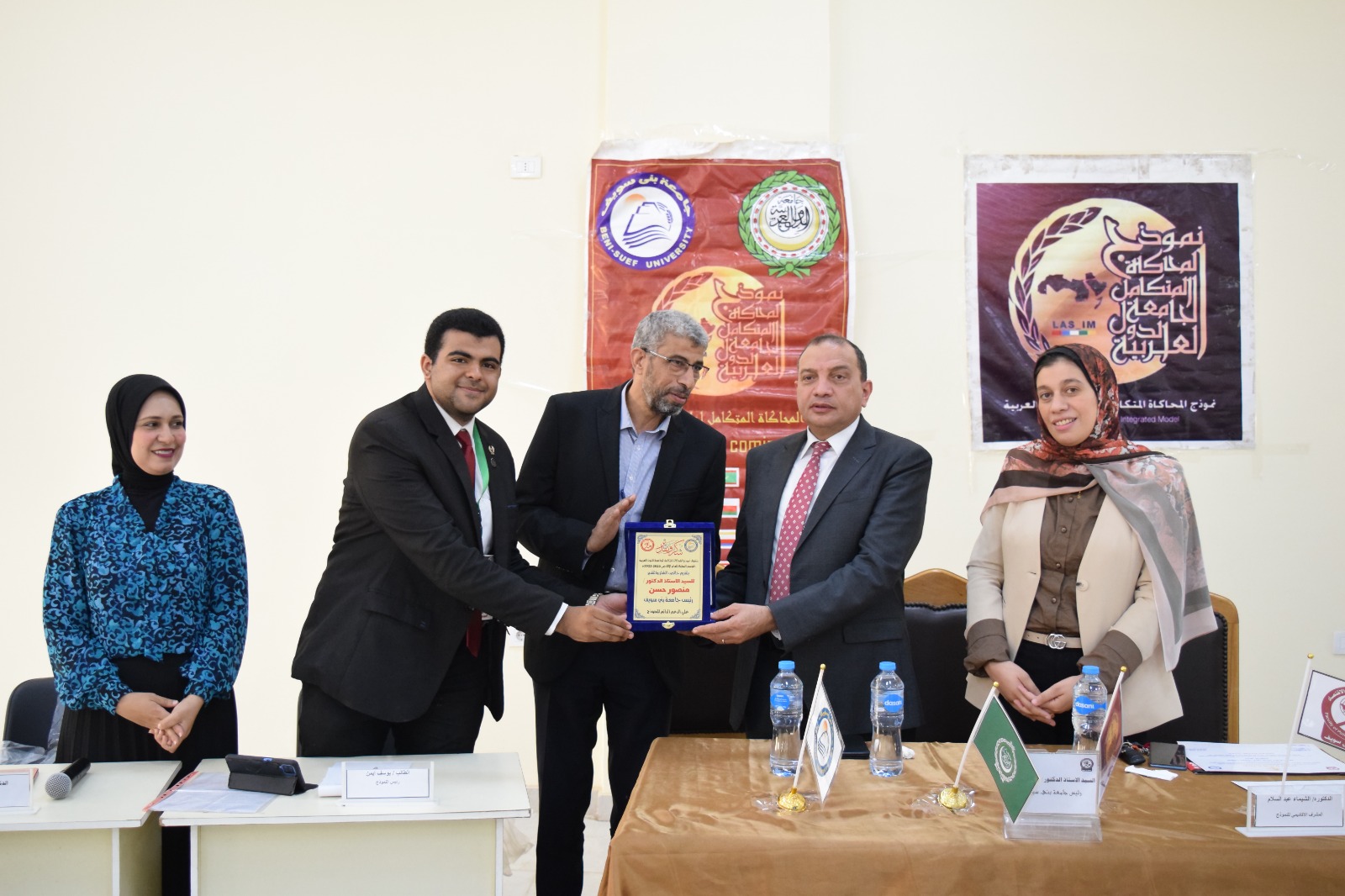 وفي نهاية نموذج المحاكاة أهدى الطلاب درع التكريم للدكتور منصور حسن رئيس جامعة بني سويف، على دعمه لجميع الأنشطة التي تخص الطلاب.