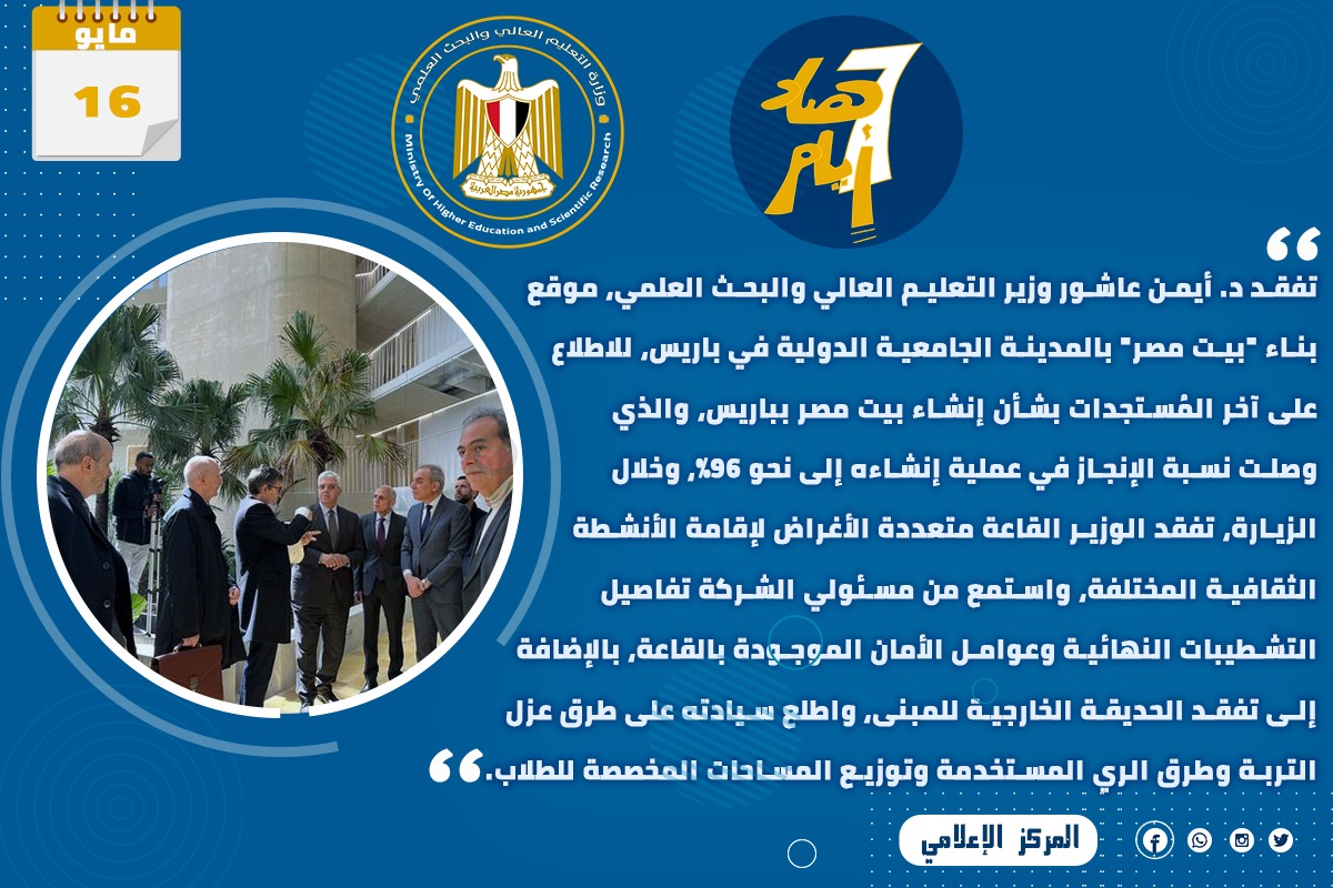 2) تفقد الدكتور أيمن عاشور وزير التعليم العالي والبحث العلمي، موقع بناء "بيت مصر" بالمدينة الجامعية الدولية في باريس، للاطلاع على آخر المُستجدات بشأن إنشاء بيت مصر بباريس، والذي وصلت نسبة الإنجاز في عملية إنشاءه إلى نحو 96%، وخلال الزيارة، تفقد الوزير القاعة متعددة الأغراض لإقامة الأنشطة الثقافية المختلفة، واستمع من مسئولي الشركة تفاصيل التشطيبات النهائية وعوامل الأمان الموجودة بالقاعة، بالإضافة إلى تفقد الحديقة الخارجية للمبنى، واطلع سيادته على طرق عزل التربة وطرق الري المستخدمة وتوزيع المساحات المخصصة للطلاب.