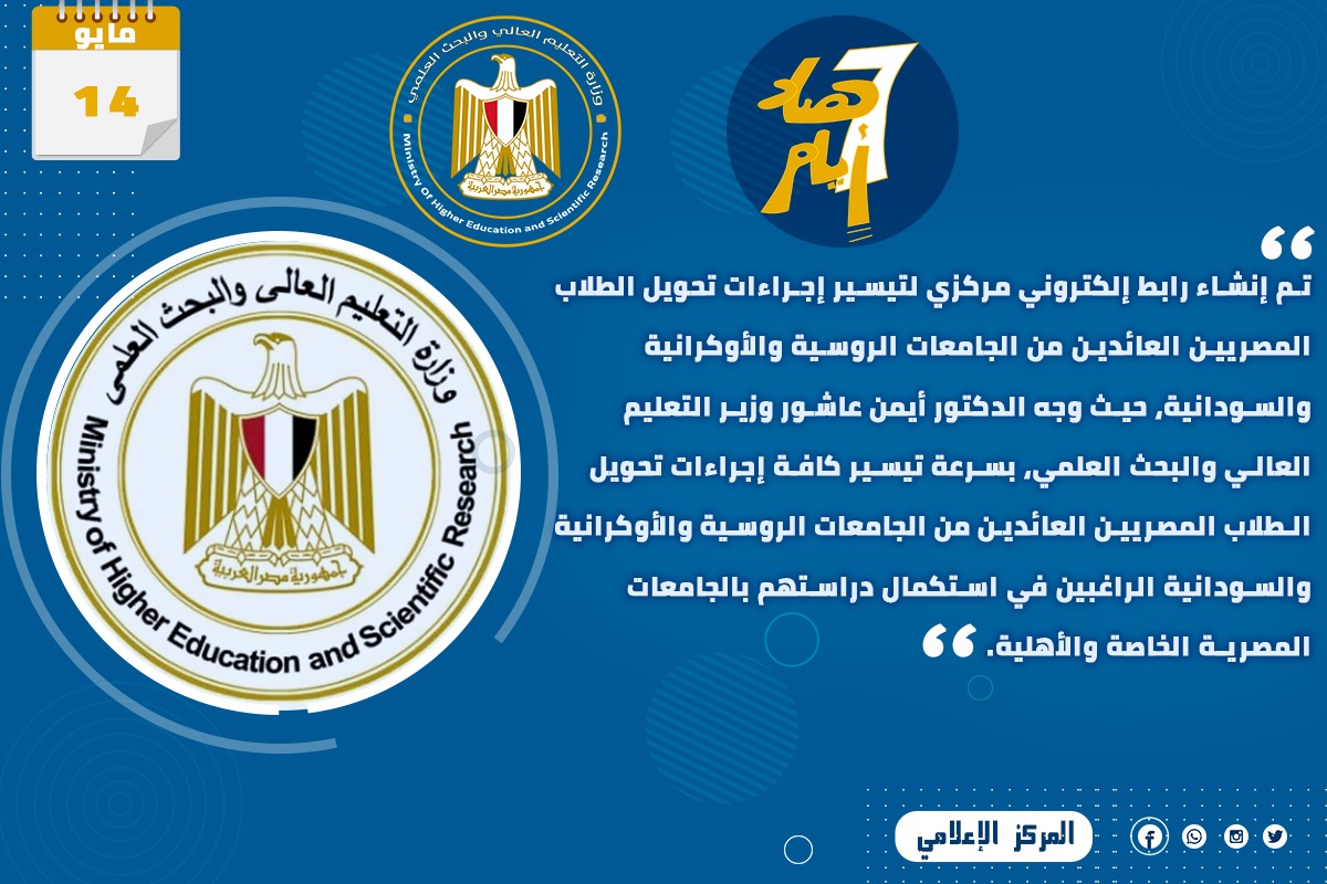 ٦) تم إنشاء رابط إلكتروني مركزي لتيسير إجراءات تحويل الطلاب المصريين العائدين من الجامعات الروسية والأوكرانية والسودانية، حيث وجه الدكتور أيمن عاشور وزير التعليم العالي والبحث العلمي، بسرعة تيسير كافة إجراءات تحويل الطلاب المصريين العائدين من الجامعات الروسية والأوكرانية والسودانية الراغبين في استكمال دراستهم بالجامعات المصرية الخاصة والأهلية.