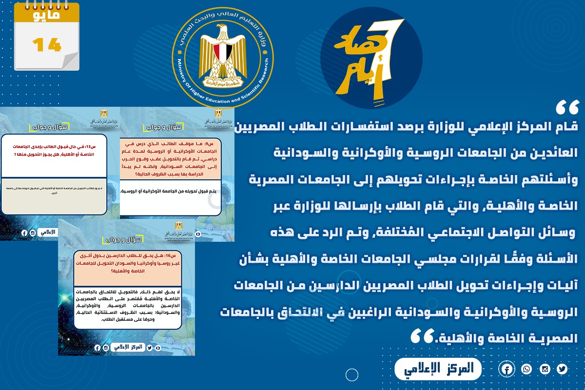 ٧) قام المركز الإعلامي للوزارة برصد استفسارات الطلاب المصريين العائدين من الجامعات الروسية والأوكرانية والسودانية وأسئلتهم الخاصة بإجراءات تحويلهم إلى الجامعات المصرية الخاصة والأهلية، والتي قام الطلاب بإرسالها للوزارة عبر وسائل التواصل الاجتماعي المختلفة، وتم الرد على هذه الأسئلة وفقًا لقرارات مجلسي الجامعات الخاصة والأهلية بشأن آليات وإجراءات تحويل الطلاب المصريين الدارسين من الجامعات الروسية والأوكرانية والسودانية الراغبين في الالتحاق بالجامعات المصرية الخاصة والأهلية.