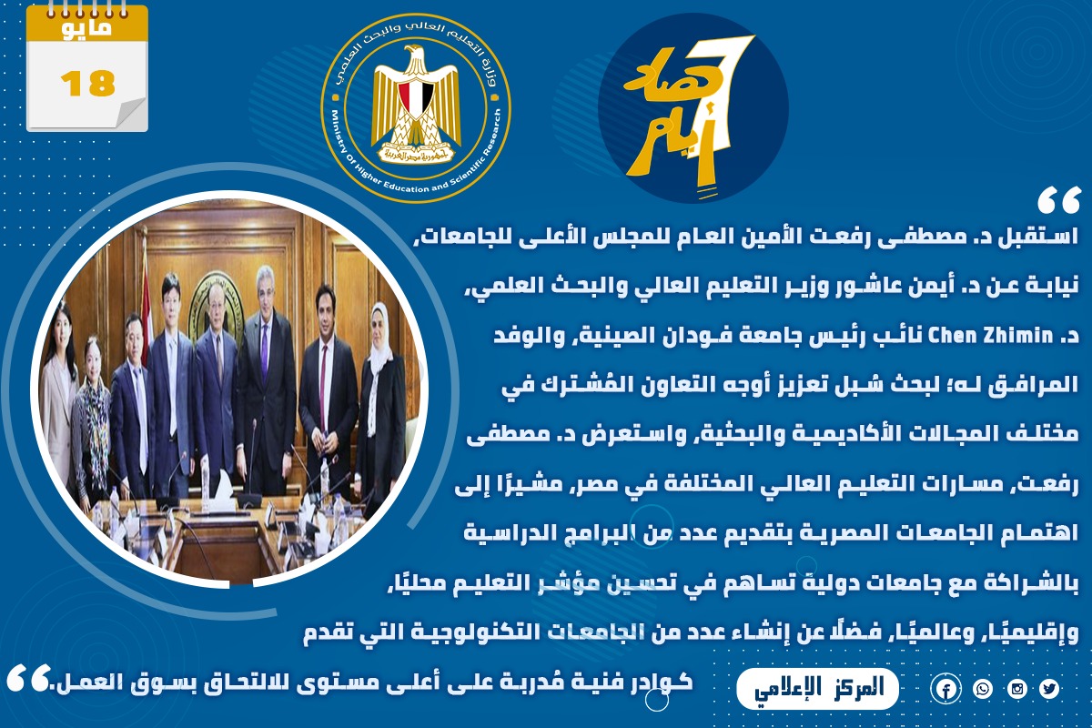4) استقبل الدكتور مصطفى رفعت الأمين العام للمجلس الأعلى للجامعات، نيابة عن الدكتور أيمن عاشور وزير التعليم العالي والبحث العلمي، الدكتور Chen Zhimin نائب رئيس جامعة فودان الصينية، والوفد المرافق له؛ لبحث سبل تعزيز أوجه التعاون المُشترك في مختلف المجالات الأكاديمية والبحثية، واستعرض الدكتور مصطفى رفعت، مسارات التعليم العالي المختلفة في مصر، مشيرًا إلى اهتمام الجامعات المصرية بتقديم عدد من البرامج الدراسية بالشراكة مع جامعات دولية تساهم في تحسين مؤشر التعليم محليًا، وإقليميًا، وعالميًا، فضلًا عن إنشاء عدد من الجامعات التكنولوجية التي تقدم كوادر فنية مدربة على أعلى مستوى للالتحاق بسوق العمل.