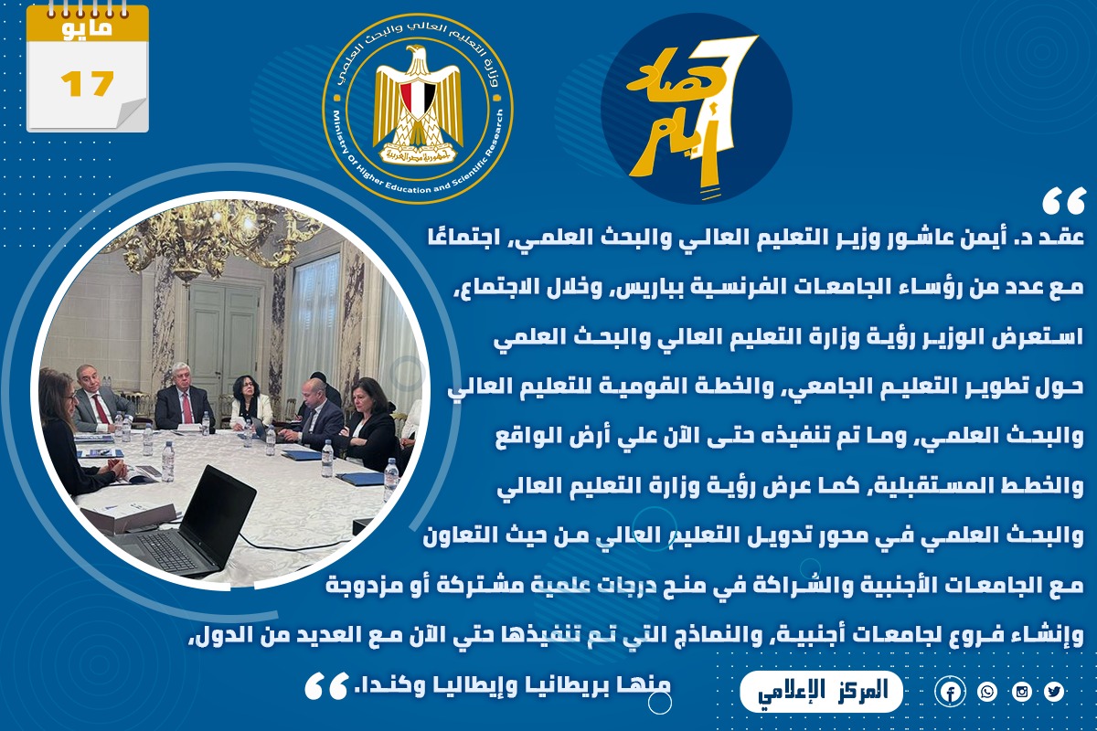 3) عقد الدكتور أيمن عاشور وزير التعليم العالي والبحث العلمي، اجتماعًا مع عدد من رؤساء الجامعات الفرنسية بباريس، وخلال الاجتماع، استعرض الوزير رؤية وزارة التعليم العالي والبحث العلمي حول تطوير التعليم الجامعي، والخطة القومية للتعليم العالي والبحث العلمي، وما تم تنفيذه حتى الآن علي أرض الواقع والخطط المستقبلية، كما عرض رؤية وزارة التعليم العالي والبحث العلمي في محور تدويل التعليم العالي من حيث التعاون مع الجامعات الأجنبية والشراكة في منح درجات علمية مشتركة أو مزدوجة وإنشاء فروع لجامعات أجنبية، والنماذج التي تم تنفيذها حتي الآن مع العديد من الدول، منها بريطانيا وإيطاليا وكندا.