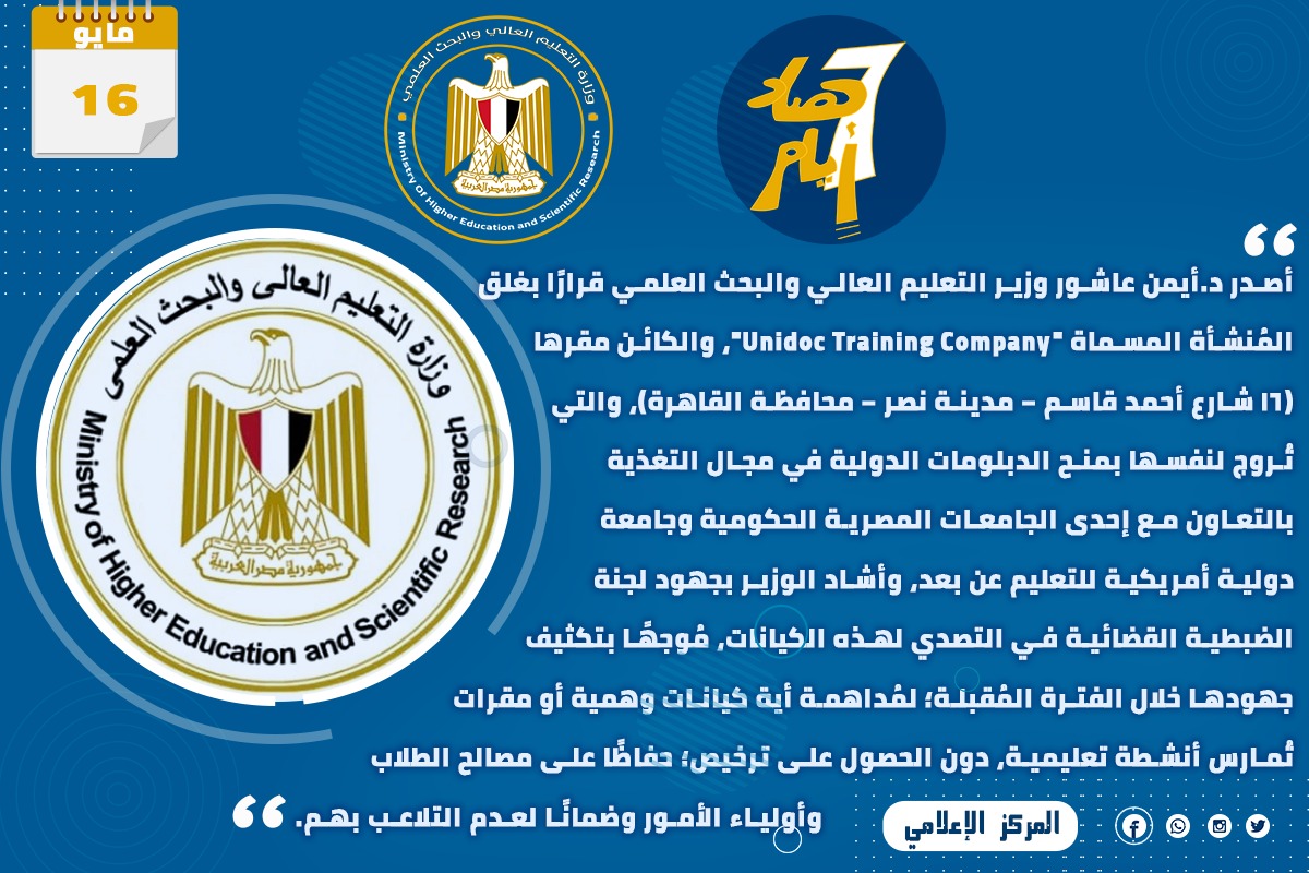 ٩) أصدر الدكتور أيمن عاشور وزير التعليم العالي والبحث العلمي قرارًا بغلق المنشأة المسماة "Unidoc Training Company"، والكائن مقرها (١٦ شارع أحمد قاسم – مدينة نصر – محافظة القاهرة)، والتي تروج لنفسها بمنح الدبلومات الدولية في مجال التغذية بالتعاون مع إحدى الجامعات المصرية الحكومية وجامعة دولية أمريكية للتعليم عن بعد، وأشاد الوزير بجهود لجنة الضبطية القضائية في التصدي لهذه الكيانات، موجهًا بتكثيف جهودها خلال الفترة المقبلة؛ لمداهمة أية كيانات وهمية أو مقرات تمارس أنشطة تعليمية، دون الحصول على ترخيص؛ حفاظًا على مصالح الطلاب وأولياء الأمور وضمانًا لعدم التلاعب بهم.