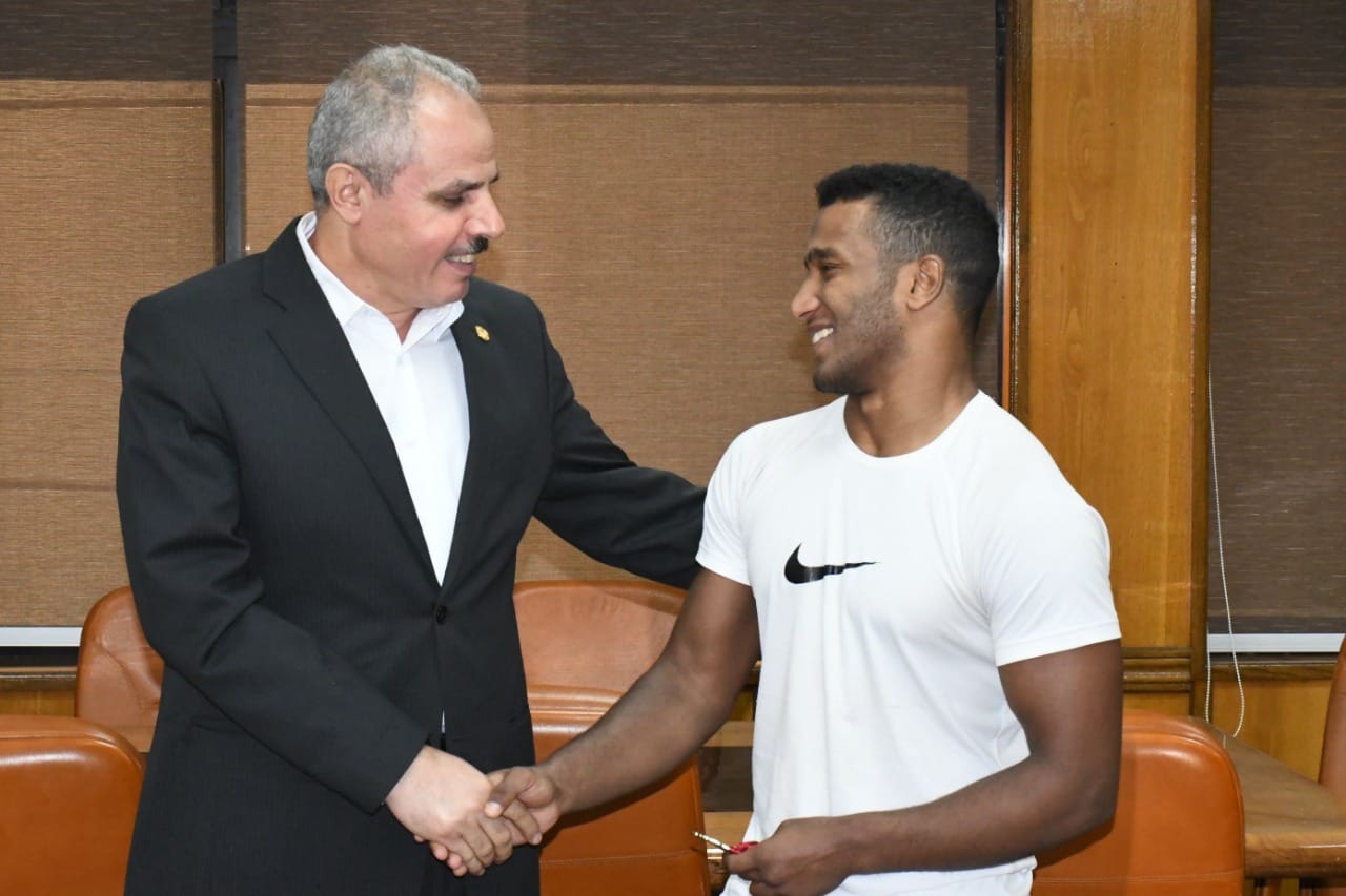 رئيس جامعة قناة السويس يهنئ الطالب محمد إيهاب بعلوم القناة لحصوله على الميداليا الذهبية بوزن 77 كجم