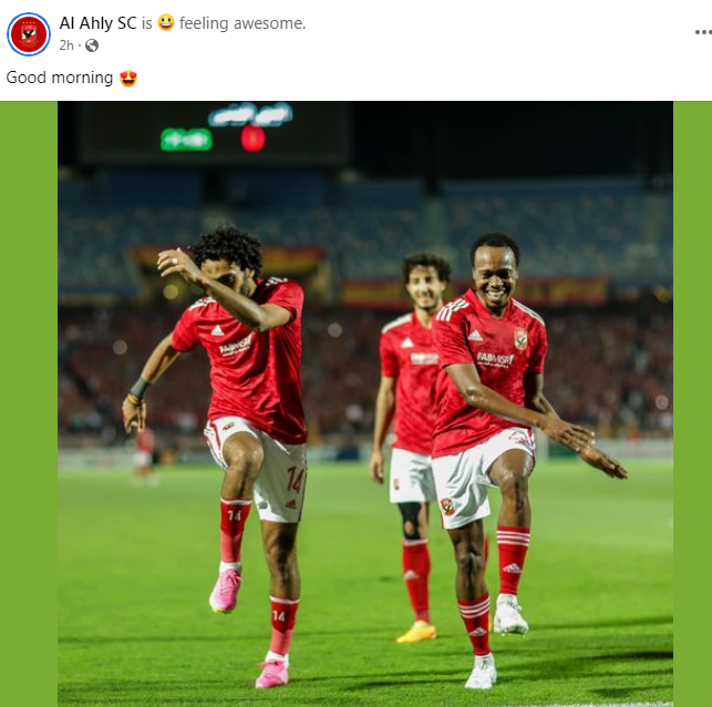 احتفلت الصفحة الرسمية للنادي الأهلي على فيس بوك بتأهل الفريق الأول لكرة القدم بالنادى لنهائي دوري أبطال أفريقيا، ونشرت صورة من "رقصة" ثنائي الفريق حسين الشحات وبيرسي تاو عقب تسجيل الأول هدف الأهلي فى الترجي التونسي أمس بنصف نهائي دوري الأبطال.