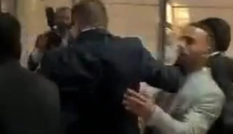 وظهر فى الفيديو قيام عمرو دياب بالهرب من إحدى بوابات الفندق فيما حاول شخص الوصول له لالتقاط صورة معه إلا أن عمرو دياب ابعده بيده، وخرج مسرعا من الفندق.