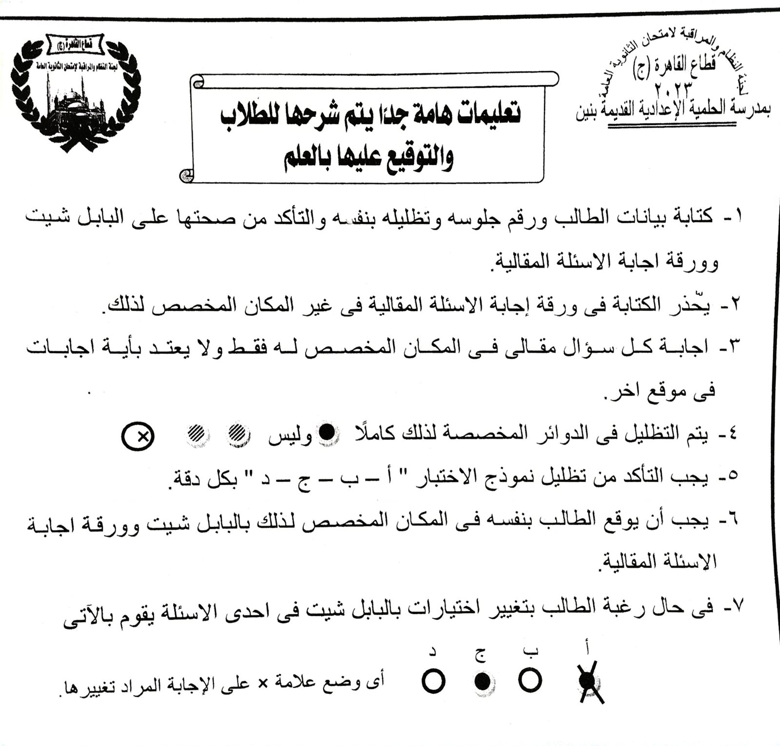 _ كتابة بيانات الطالب ورقم جلوسه وتظليله بنفسه والتأكد من صحتها على البابل شيت وورقة اجابة الأسئلة المقالية
