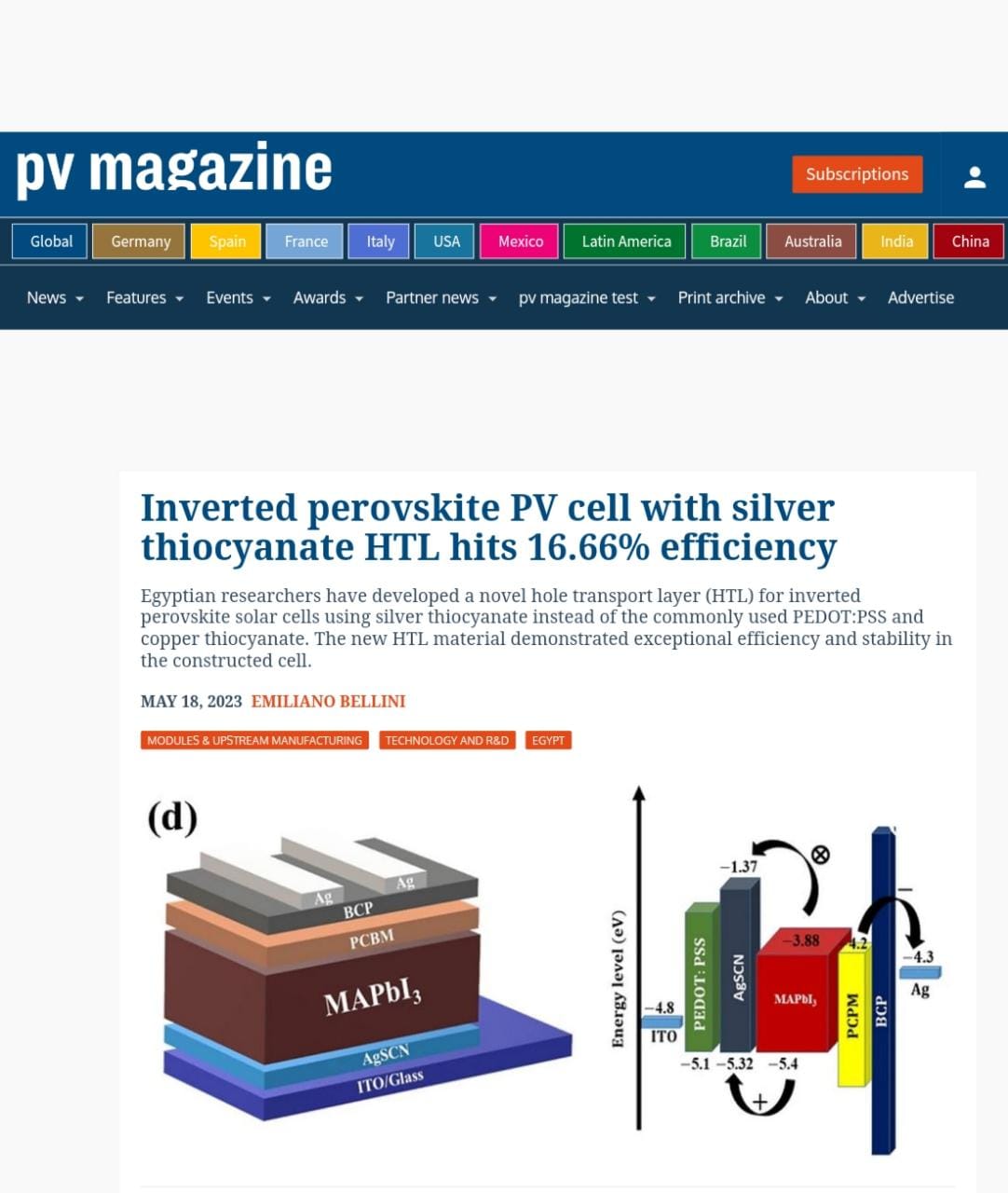 وقد أبرزت مجلة PV الدولية المتخصصة في مجال تجارة الطاقة الشمسية والكهروضوئية تقريرًا عن نجاح الباحثين بمركز بحوث وتطوير الفلزات في تصنيع خلية شمسية "بيروفسكايت" مقلوبة من نوع جديد اعتمادًا على طبقات نقل الثقوب (HTM) ثيوسانات الفضة، مشيرة لأهمية نتائج البحث في استبدال مواد نقل الشحنات الشائعة الاستخدام مثل ثيوسيانات النحاس و PEDOT:PSS، حيث تتميز المادة الجديدة بمقاومة أكبر، ومعدل انتشار أبطأ، وقدرة أفضل في نقل الشحنات بين طبقة HTL و pedot: pss