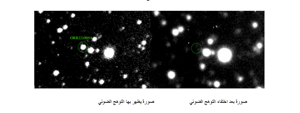 وأوضحت الصورة التالية المأخوذة بمنظار القطامية الفلكي هذا التوهج الضوئي الناتج عن الانفجار القوى في أشعة جاما، وكذلك صورة بعد خفتان واختفاء هذا التوهج: