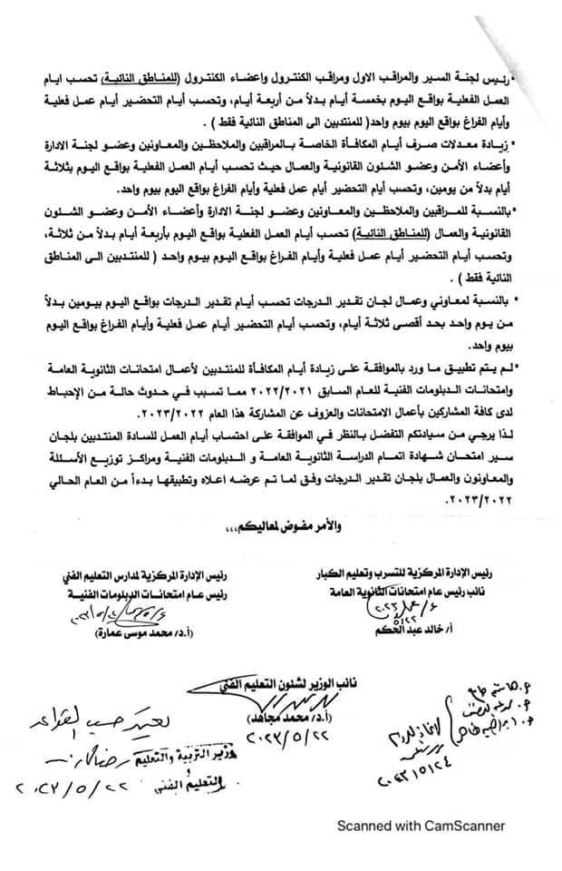 وحيث أنه في العام الدراسي السابق 2021 / 2022 وقد وافق وزير التربية والتعليم انذاك على زيادة أيام المكافأة الخاصة بالمنتدبين بلجان سير امتحانات الثانوية العامة وامتحانات الدبلومات الفنية ومراكز توزيع الأسئلة والمعاونون والعمال بجان تقدير الدرجات لتصبح على النحو التالي: رئيس لجنة السير والمراقب الأول ومراقب الكنترول وأعضاء الكنترول وتحسب أيام العمل الفعلية بواقع 5 أيام بدلا من 4 ايام، وتحسب ايام التحضير ايام عمل فعلية وأيام الفراغ بواقع يوم واحد للمنتدبين الى المناطق النائية فقط، وزيادة معدلات صرف أيام المكافأة الخاصة بالمراقبين والملاحظين والمعاونين وعضو لجنة الإدارة وأعضاء الأمن وعضو الشئون القانونية والعمال حيث تحسب أيام العمل الفعلية بواقع اليوم بـ 3 أيام بدلا من يومين وتحسب أيام التحضير أيام عمل فعلية وأيام الفراغ بواقع اليوم بيوم واحد، وبالنسبة للمراقبين والملاحظين والمعاونين وعضو لجنة الإدارة وأعضاء الأمن وعضو الشئون القانونية والعمال للمناطق النائية، تحسب أييام العمل الفعلية بواقع اليوم بـ 4 أيام بدلا من 3، وتحسب أيام التحضير أيام عمل فعلية وأيام الفراغ بواقع اليوم بيوم واحد للمنتدبين إلى المناطق النائية