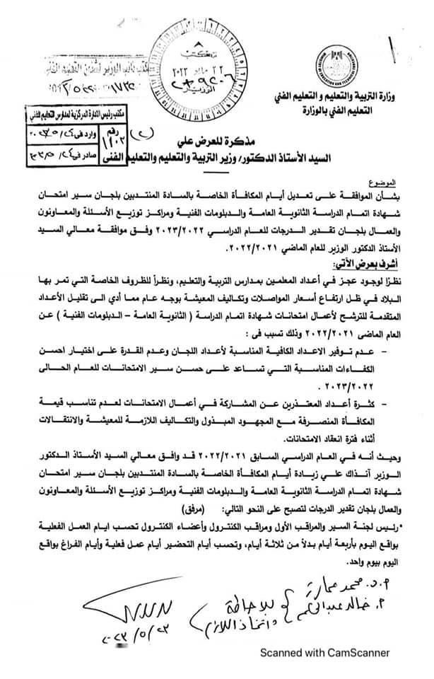 و بالنسبة لمعاوني وعمال لجان تقدير الدرجات حسب أيام تقدير الدرجات بواقع اليوم بيومين بدلا من يوم واحد بحد أقصى 3 أيام وتحسب أيام التحضير أيام عمل فعلية وأيام الفراغ بواقع اليوم بيوم واحد، ولم يتم تطبيق ما ورد بالموافقة على زيادة أيام المكافآة للمنتدبين لأعمال امتحانات الثانوية العامة وامتحانات الدبلومات الفنية العام الماضي مما تسبب في حدوث حالة من الإحباط لدى كافة المشاركين في أعمال الامتحانات والعزوف عن المشاركة هذا العام 2022 / 2023