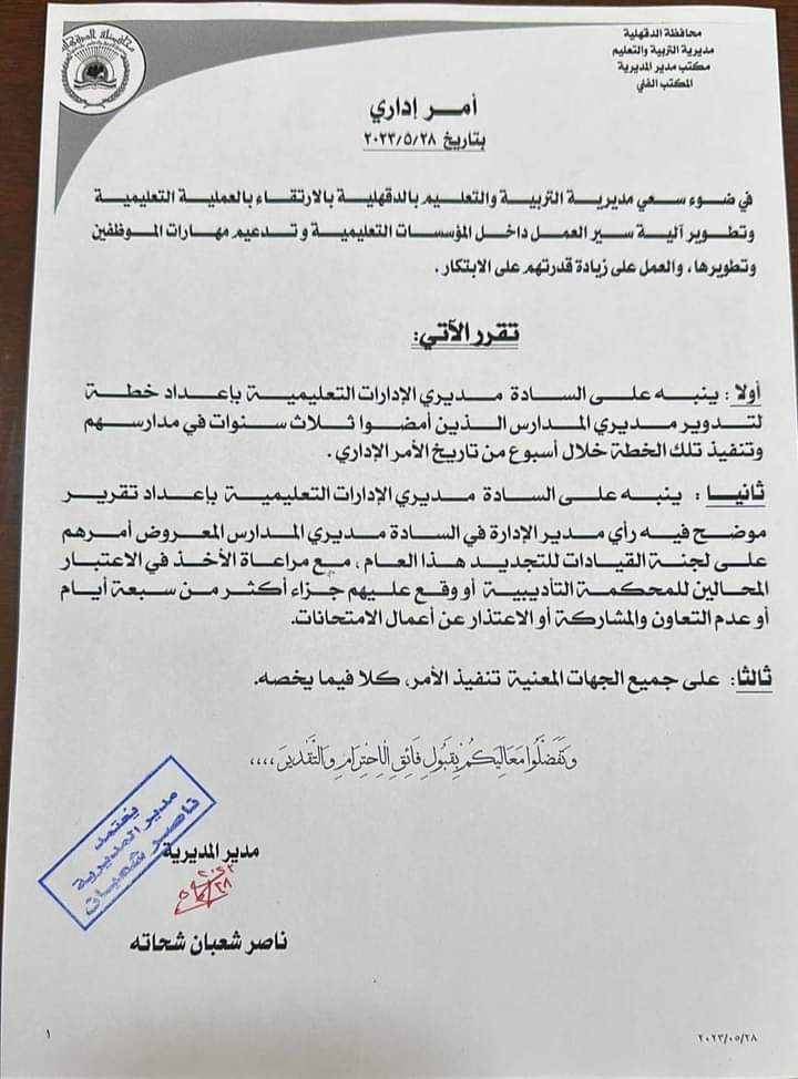 _ ينبه على مديري الإدارات التعليمية بإعداد خطة لتدوير مديري المدارس الذين أمضوا ثلاث سنوات في مدارسهم وتنفيذ تلك الخطة خلال أسبوع من تاريخ الأمر الإداري