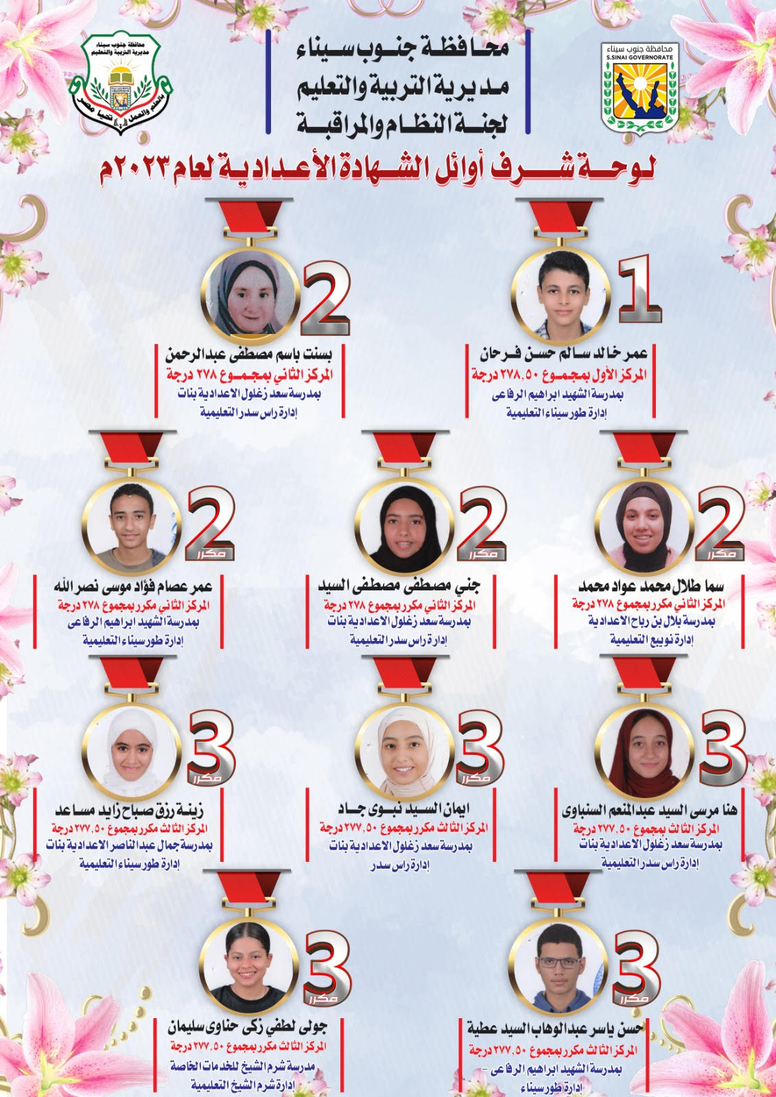 الأوائل في نتيجة الشهادة الإعدادية في جنوب سيناء
