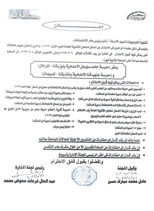 وأشارت وزارة التربية والتعليم إلى أنه لن يتم قبول اى اعتذرات من المنتدبين لأعمال امتحانات الثانوية العامة إلا طبقا للحالات الموضحة بعاليه لن يتم قبول اى اعتذارات من المقدرين إلا من خلال مشرف عام التقدير لن يتم قبول اى اعتذارات في المقر الرئيسي للجنة الادارة.