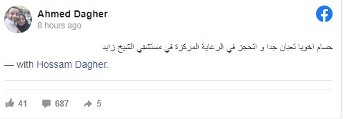 كتب شقيق حسام داغر عبر حساب الفنان على موقع التواصل الاجتماعي فيسبوك: "حسام اخويا تعبان جدا واتحجز في الرعاية المركزة في مستشفي الشيخ زايد".