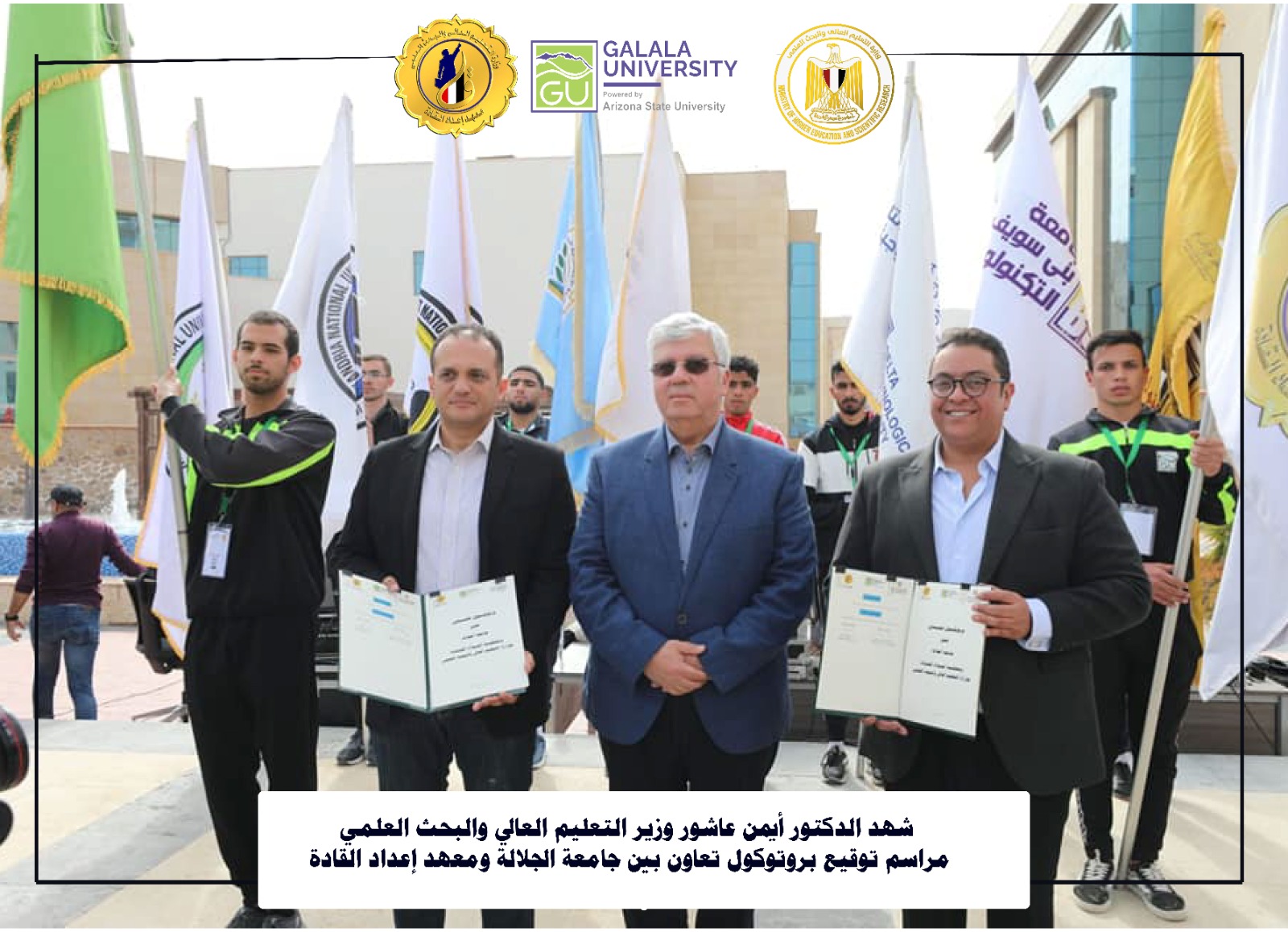 وقد شهد الدكتور أيمن عاشور، وزير التعليم العالي والبحث العلمي، مراسم توقيع بروتوكول تعاون بين جامعة الجلالة ومعهد إعداد القادة في وزارة التعليم العالي، كما تم توقيع بروتوكول تعاون مشترك بين المعهد واتحاد الجامعات العربية لتنفيذ البرامج والدورات التدريبية وورش العمل بين الطرفين.