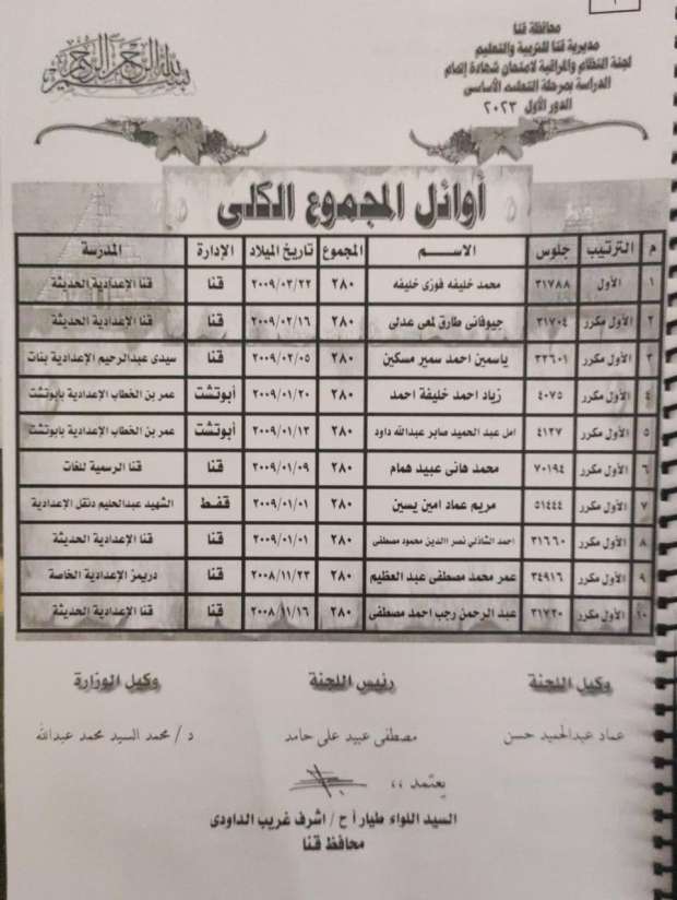 أسماء أوائل الشهادة الإعدادية 2023 في محافظة قنا