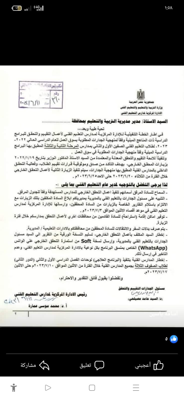 ووجهت وزارة التربية والتعليم والتعليم الفني لمدير عام التعليم الفني بالمديريات والإدارات بما يلى: