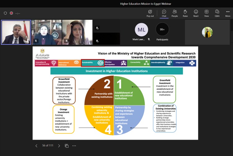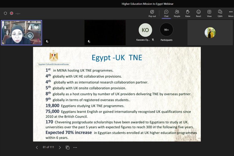 وأشارت الملحق الثقافي ومدير البعثة التعليمية بالمملكة المتحدة وأيرلندا، إلى دور المكتب الثقافي المصري بلندن في فتح قنوات تعاون مشترك مع الجامعات والأكاديميات البريطانية، بالإضافة إلى إلقاء الضوء على قانون الاستثمار في مجال التعليم العالي المصري ودور مصر الرائد في المنطقة المحيطة، كما ألقت الضوء على الرؤية المستقبلية لمنظومة التعليم العالي والبحث العلمي في مصر، والتي تستهدف الاهتمام بتدويل التعليم العالي، وتعظيم الشراكة مع الجامعات العالمية المرموقة، حيث تسعى الجامعات المصرية لمزيد من الشراكات مع الجامعات البريطانية، وفتح المجال أمام إنشاء المزيد من فروع الجامعات البريطانية في مصر، وذلك في تشجيع ودعم الحكومة المصرية على الاستثمار في مجال التعليم.