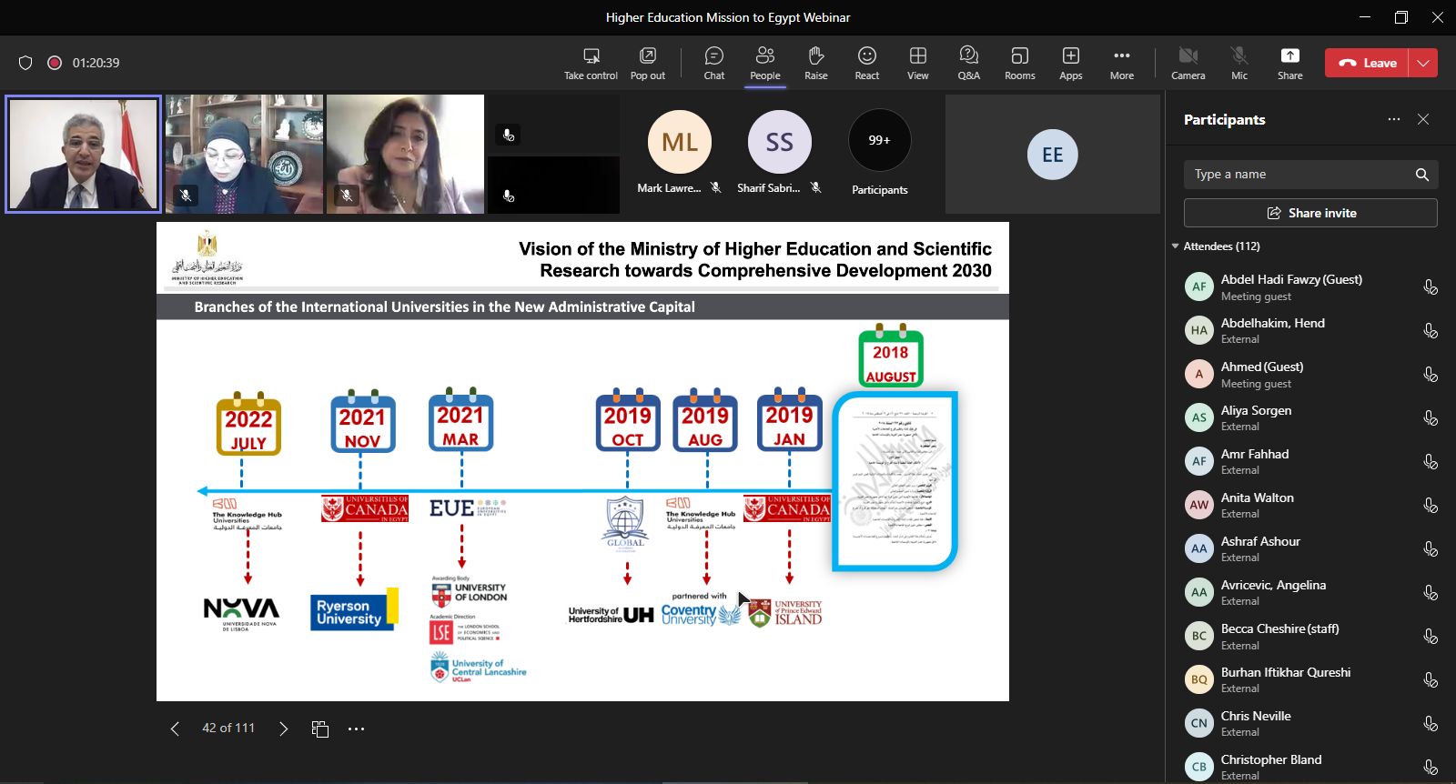 وفي كلمته، أكد الدكتور مصطفى رفعت الأمين العام للمجلس الأعلى للجامعات، أهمية دعم علاقات التعاون العلمي والبحثي والتكنولوجي مع بريطانيا، مشيدًا بالعلاقات المُتميزة التي تربط بين مصر وبريطانيا، والتعاون بين الجانبين في مجال التعليم العالي، مُقدمًا عرضًا تقديميًا تناول استراتيجية التعليم العالي والبحث العلمي وخطة وزارة التعليم العالي والبحث العلمي لفرص التعاون في مجال التعليم عبر الحدود، مشيرًا إلى أن هناك نحو 3.3 مليون طالب بالجامعات المصرية، و27 جامعة حكومية، و27 جامعة خاصة، و20 جامعة أهلية، و10 جامعات تكنولوجية، 7 أفرع لجامعات دولية بالعاصمة الإدارية الجديدة.