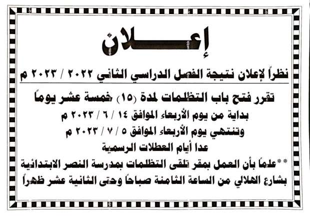 - تسليم طلب تظلمات الشهادة الإعدادية للجنة النظام والمراقبة التابع لها الطالب.