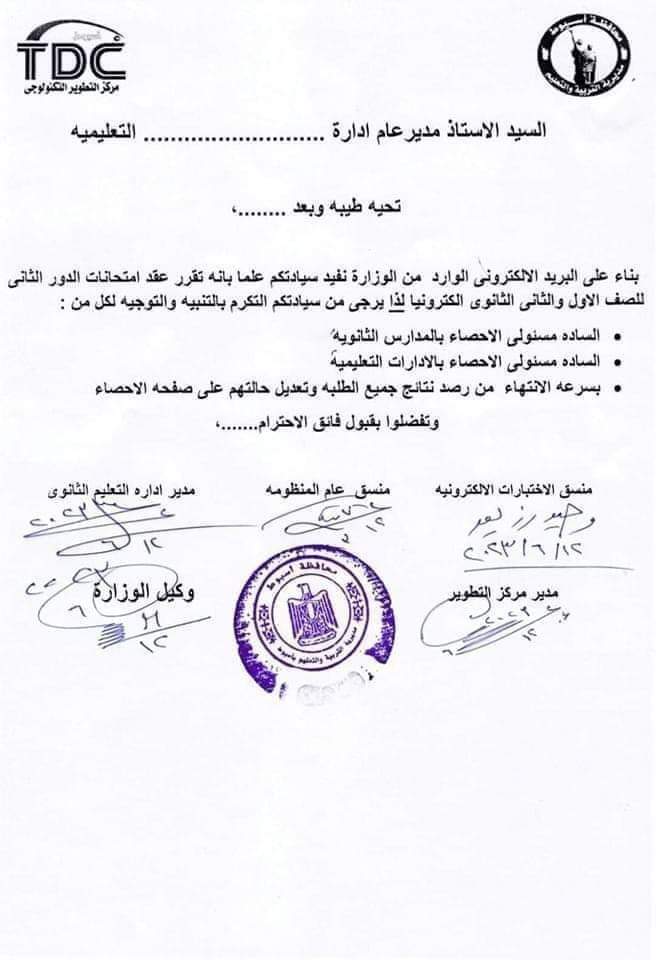 وأوضح الخطاب إنه تقرر عقد امتحانات هذين الصفين، إلكترونيا، موجها مسؤولى الإحصاء بالمدارس الثانوية، ومسؤولى الإحصاء بالإدارات التعليمية، بسرعة الانتهاء من رصد نتائج جميع الطلاب وتعديل حالتهم على صفحة الإحصاء.