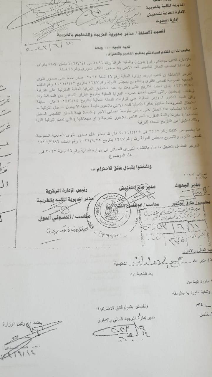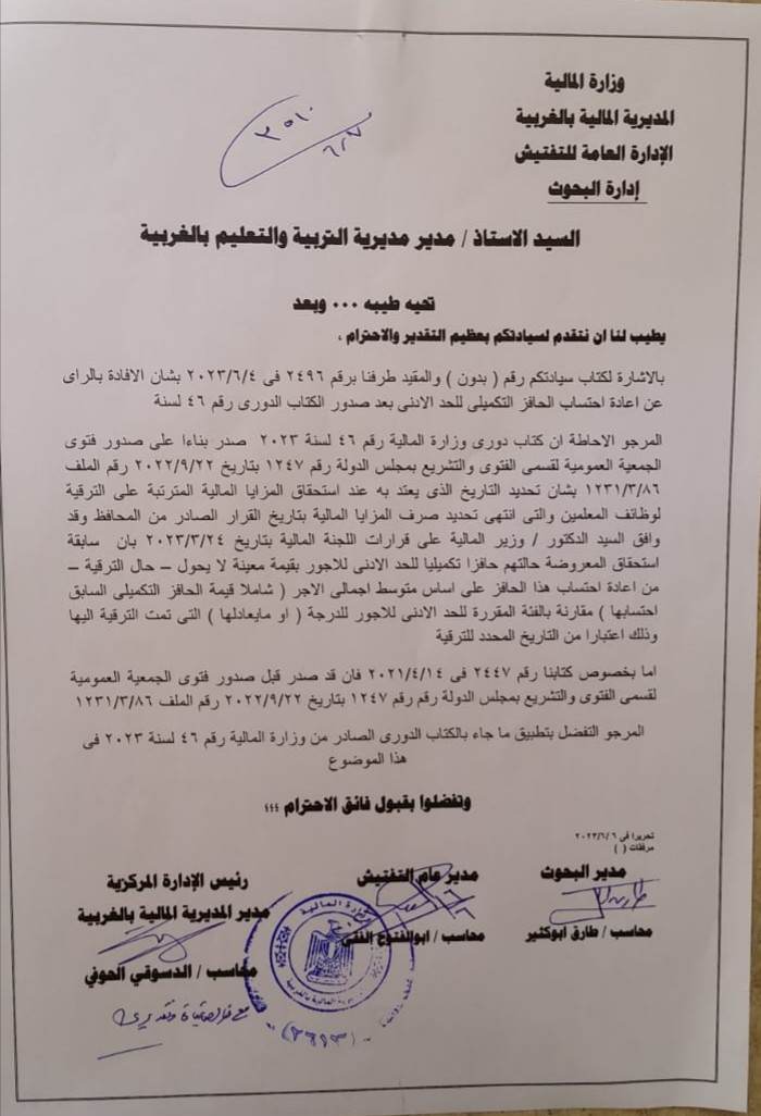 جاء هذا بناءا على مخاطبة مديرية التربية والتعليم للمالية فى كتابها والمقيد برقم ٢٤٩٦ فى ٤_٦_٢٠٢٣ للإفادة بالرأي عن إعادة احتساب الحافز التكميلي للحد الأدنى بعد صدور الكتاب الدور رقم ٤٦ لسنة ٢٠٢٣.