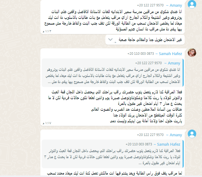 وأشارت ولي الأمر في شكوتها التي نشرتها عبر جروب حوار مجتمعي تربوي، مراقبي اللجنة يتعمدوا إزعاج الطالبات بالكلام الجارح والسب، متسائله لماذا يتعاملوا مع طالبات بامتحان بهذا الشكل.