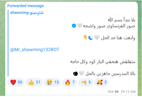 وقال أدمن جروب شاومينج السري عبر تطبيق "تيلجرام" لنشر الامتحانات، لطلاب الثانوية العامة: "يلا نبدأ بسم الله، صور الفرنساوي صور واضحة وابعت هنا خد الحل، متقلقش هنخفي البار كود وكل حاجة، متابعا: يالا المدرسين جاهزين بالحل".