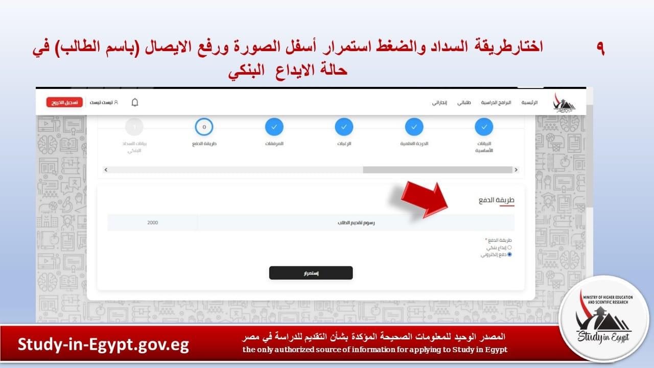 ٩- اختار طريقة السداد والضغط استمرار أسفل الصورة ورفع الإيصال (باسم الطالب) في حالة الإيداع البنكي.