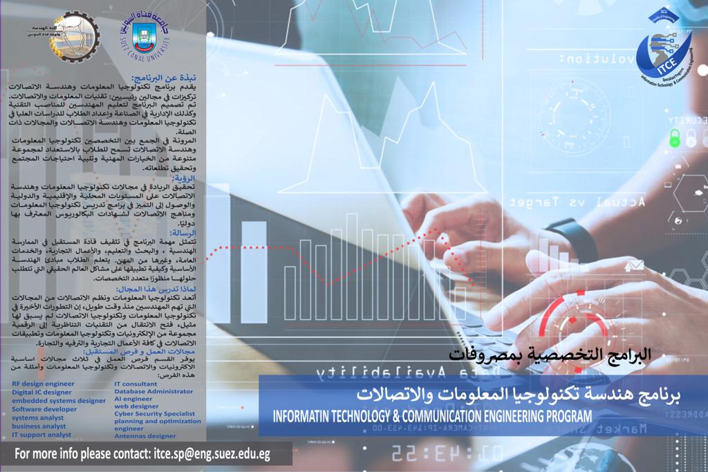 أما البرنامج الرابع الذي تقدمه كلية الهندسة جامعة قناة السويس، للطلاب الجدد هو برنامج هندسة تكنولوجيا المعلومات والاتصالات والذي يرتكز في مجالين رئيسيين: تقنيات المعلومات والاتصالات، وتم تصميم البرنامج لتأهيل المهندسين للمناصب التقنية وكذلك الإدارية في الصناعة، وإعداد طلاب للدراسات العليا في تكنولوجيا المعلومات وهندسة الاتصالات والمجالات ذات الصلة، والمرونة في الجمع بين التخصصين تكنولوجيا المعلومات وهندسة الاتصالات تسمح للطلاب بالاستعداد لمجموعة متنوعة من الخيارات المهنية وتلبية احتياجات المجتمع وتحقيق تطلعاته.