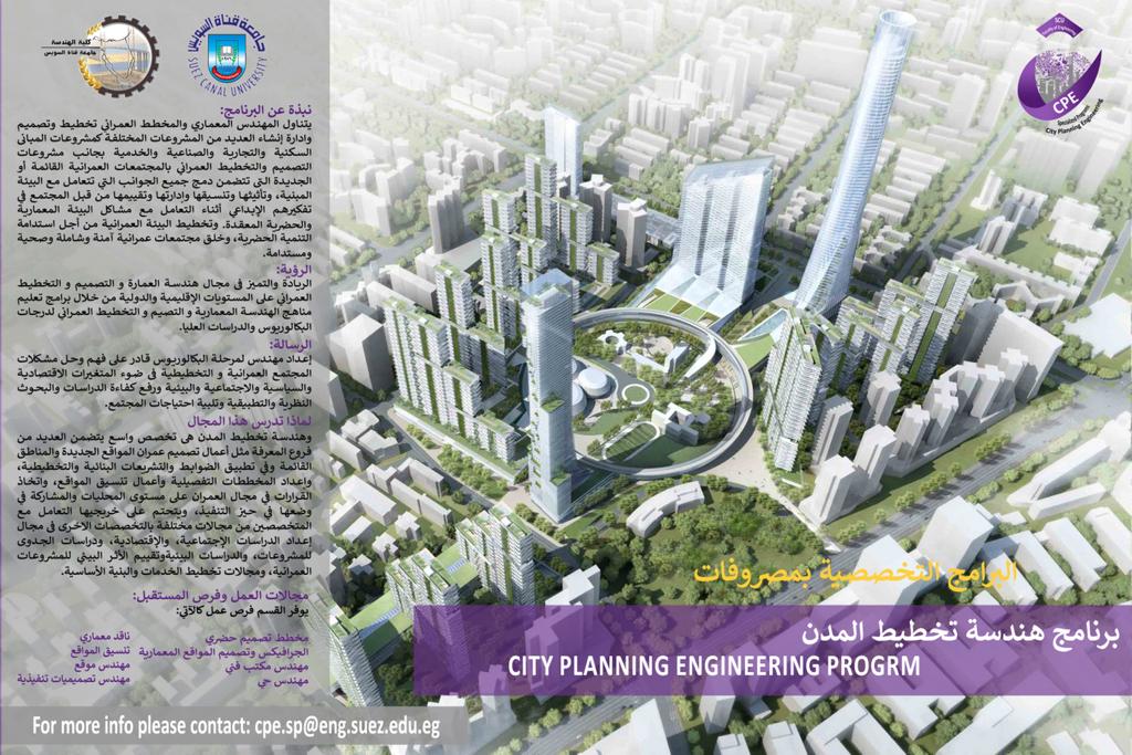 وعن برنامج تخطيط المدن، أفاد الدكتور إيهاب لطفي عميد كلية الهندسة جامعة قناة السويس، أنه يتناول المهندس المعماري والمخطط العمراني، تخطيط وتصميم وإدارة إنشاء العديد من المشروعات المختلفة، كمشروعات المباني السكنية والتجارية والصناعية والخدمية، بجانب مشروعات التصميم والتخطيط العمراني بالمجتمعات العمرانية القائمة أو الجديدة، التي تتضمن دمج جميع الجوانب التي تتعامل مع البيئة المبنية، وتأثيثها وتنسيقها وإدارتها وتقييمها من قبل المجتمع في تفكيرهم الإبداعي أثناء التعامل مع مشاكل البيئة المعمارية والحضرية المعقدة، وتخطيط البيئة العمرانية من أجل استدامة التنمية الحضرية، وخلق مجتمعات عمرانية آمنة وشاملة وصحية ومستدامة.