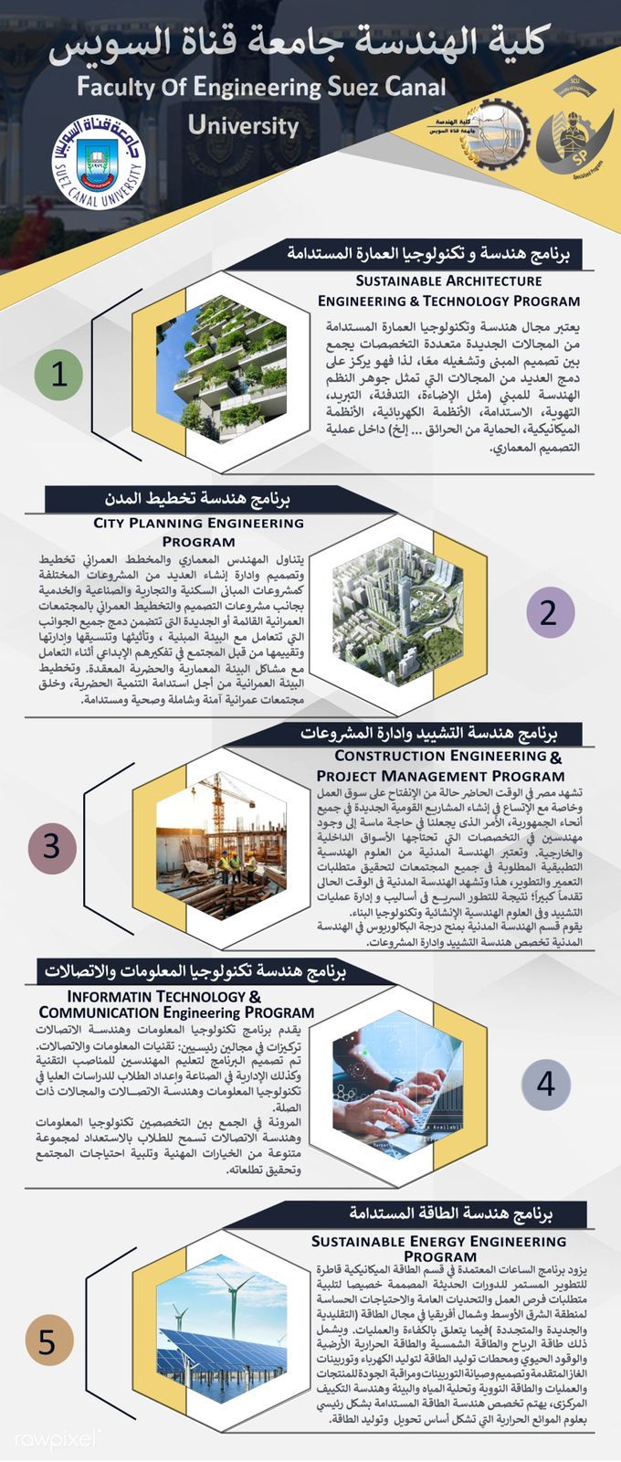 أعلن الدكتور ناصر مندور رئيس جامعة قناة السويس، عن فتح باب التقدم لخمسة برامج تخصصية جديدة مميزة بكلية الهندسة وهى: برنامج هندسة تكنولوجيا المعلومات والاتصالات، برنامج هندسة التشييد وإدارة المشروعات، برنامج هندسة الطاقة المستدامة، برنامج هندسة تخطيط المدن، برنامج هندسة وتكنولوجيا العمارة المستدامة.