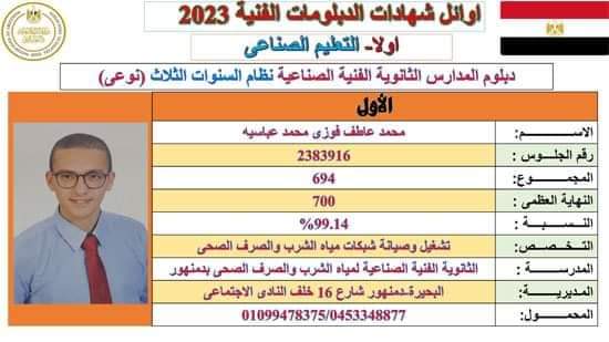 الطالب / محمد عاطف فوزى محمد عباسية الأول على مستوى الجمهورية دبلوم المدارس الفنية الصناعية نظام السنوات الثلاث ( نوعى ) بمجموع ٦٩٤ درجة ونسبة ٩٩.١٤% تخصص تشغيل وصيانة شبكات مياة الشرب والصرف الصحي بالمدرسة الثانوية الفنية الصناعيه لمياه الشرب والصرف الصحي بدمنهور.