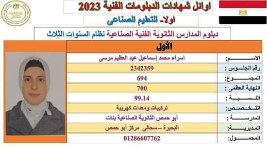 الطالبة/ إسراء محمد إسماعيل عبد العظيم مرسى الأولى على مستوى الجمهورية بدبلوم المدارس الثانوية الفنية الصناعيه نظام السنوات الثلاث بمجموع ٦٩٤ درجة ونسبة ٩٩.١٤% تخصص تركيبات ومعدات كهربية بمدرسة أبو حمص الثانوية الصناعيه بنات بإدارة أبو حمص التعليمية.