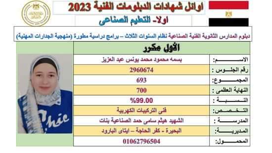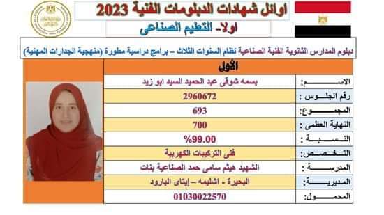 الطالبة بسمة شوقى عبد الحميد السيد أبو زيد الأولى على مستوى الجمهورية دبلوم المدارس الثانوية الفنية الصناعيه نظام السنوات الثلاث برامج دراسية مطورة ( منهجية الجدارات المهنية ) تخصص فنى التركيبات الكهربية بمدرسة الشهيد هيثم سامى حمد الصناعية بنات التابعة لادارة ايتاى البارود التعليمية بمجموع ٦٩٣ درجة ونسبة ٩٩%