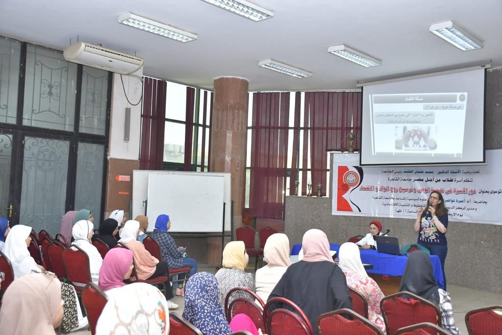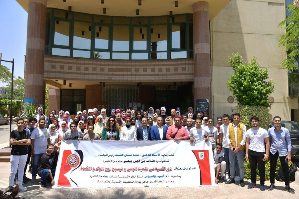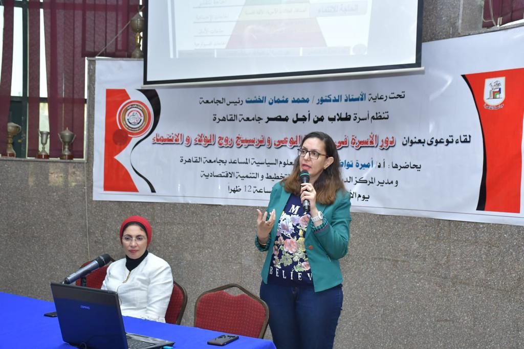 نظمت أسرة طلاب من أجل مصر جامعة القاهرة، تحت رعاية الدكتور محمد عثمان الخشت رئيس الجامعة، لقاءً توعويًا بعنوان "دور الأسرة في تنمية الوعي وترسيخ روح الولاء والانتماء"، حاضرت فيها الدكتورة أميرة تاوضروس الأستاذ المساعد بكلية الاقتصاد والعلوم السياسية ومديرة المركز الديموجرافي بوزارة التخطيط والتنمية الاقتصادية، وبحضور الدكتورة جيهان المنياوي منسق عام أسرة طلاب من أجل مصر جامعة القاهرة.