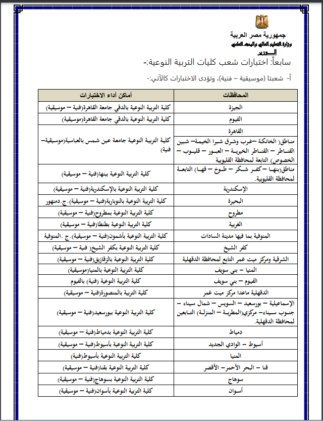 7- كليات التربية النوعية شعبتا (التربية الفنية والتربية الموسيقية)، وشعبة المسرح التربوي بكلية التربية النوعية جامعة المنصورة.