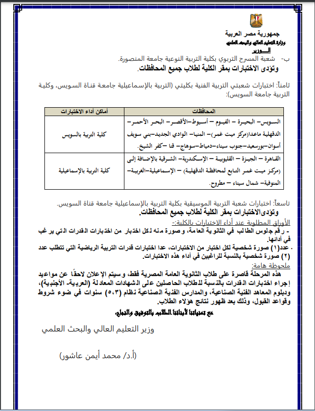 الأوراق المطلوبة عند أداء اختبارات القدرات بالكلية: