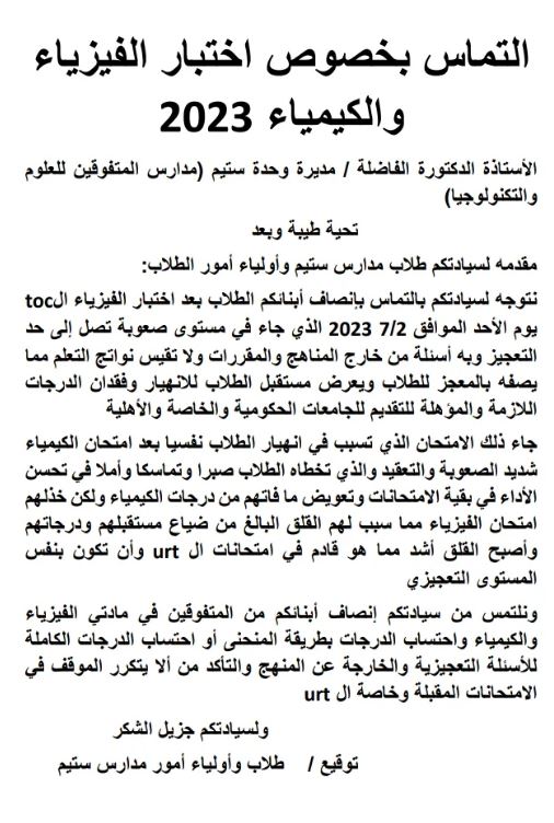 وقال أولياء الأمور في الالتماس المقدم للوزارة: نتوجه لسيادتكم بالتماس لإنصاف أبنائكم الطلاب بعد اختبار الفيزياء الـ toc يوم الأحد الموافق 7/2 2023، والذي جاء في مستوى صعوبة تصل إلى حد التعجيز وبه أسئلة من خارج المناهج والمقررات، ولا تقيس نواتج التعلم مما يصفه بالمعجز للطلاب، ويعرض مستقبل الطلاب للانهيار وفقدان الدرجات اللازمة والمؤهلة للتقديم للجامعات الحكومية والخاصة والأهلية.