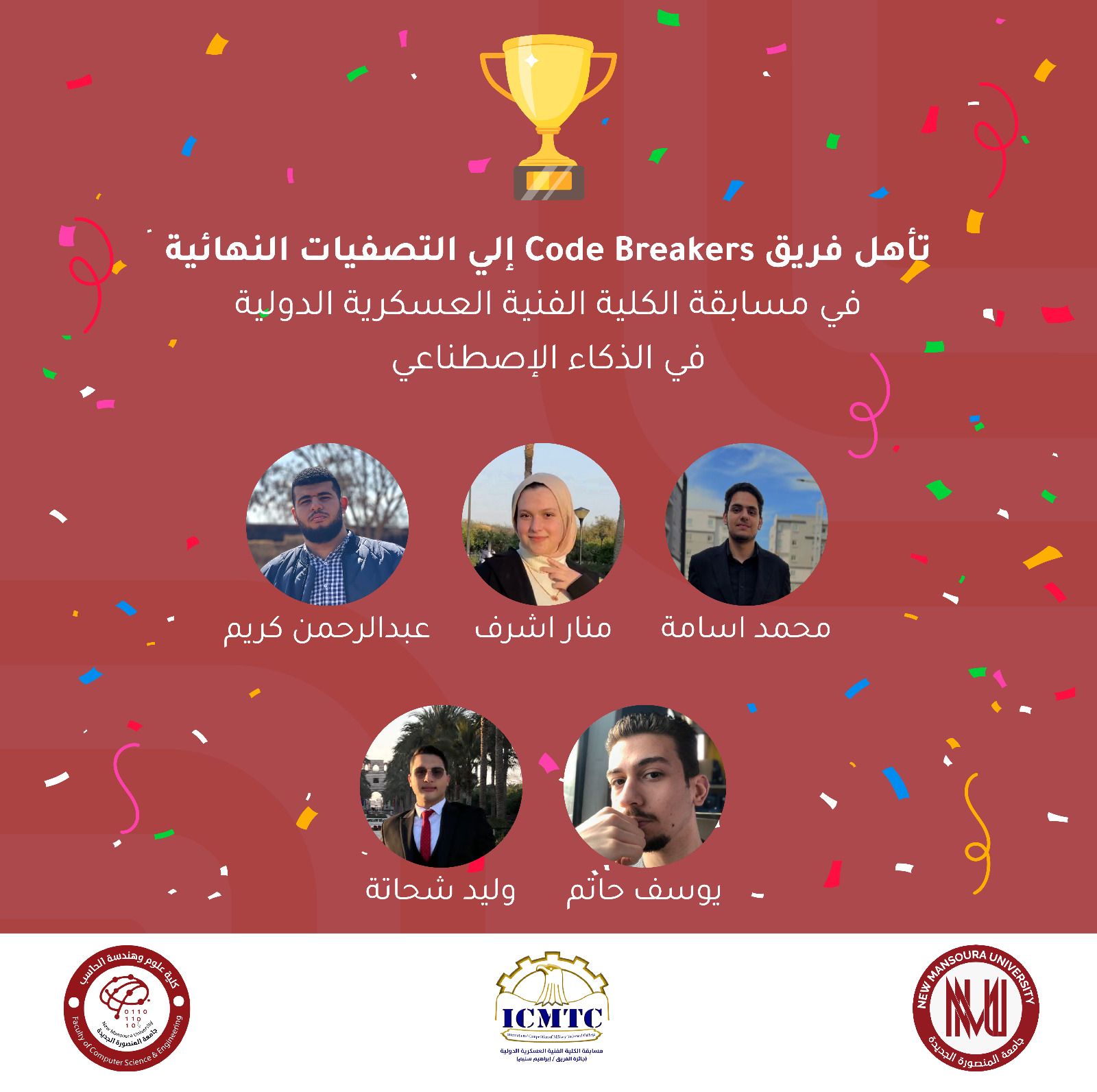وضم فريق كلية علوم وهندسة الحاسب جامعة المنصورة الجديدة، كل من الطالب عبدالرحمن أحمد كريم، والطالب يوسف حاتم عبدالمحسن، والطالب محمد أسامة ثروت، والطالب وليد وائل شحاتة، والطالبة منار أشرف الدسوقي.