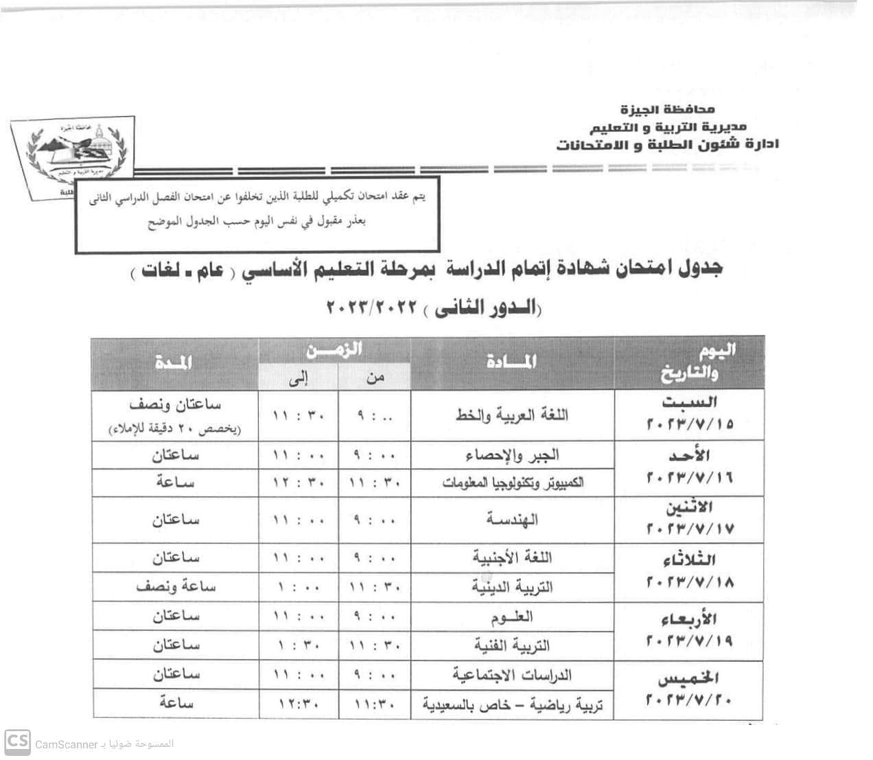 تنطلق امتحانات "الدور الثانى" للعام الدراسي 2022/2023 لطلاب شهادة إتمام الدراسة بمرحلة التعليم الأساسى (عام - لغات) بمحافظة الجيزة، يوم غد السبت الموافق 15 يوليو، والتي تستغرق 6 أيام حتى يوم الخميس الموافق 20 يوليو 2023.