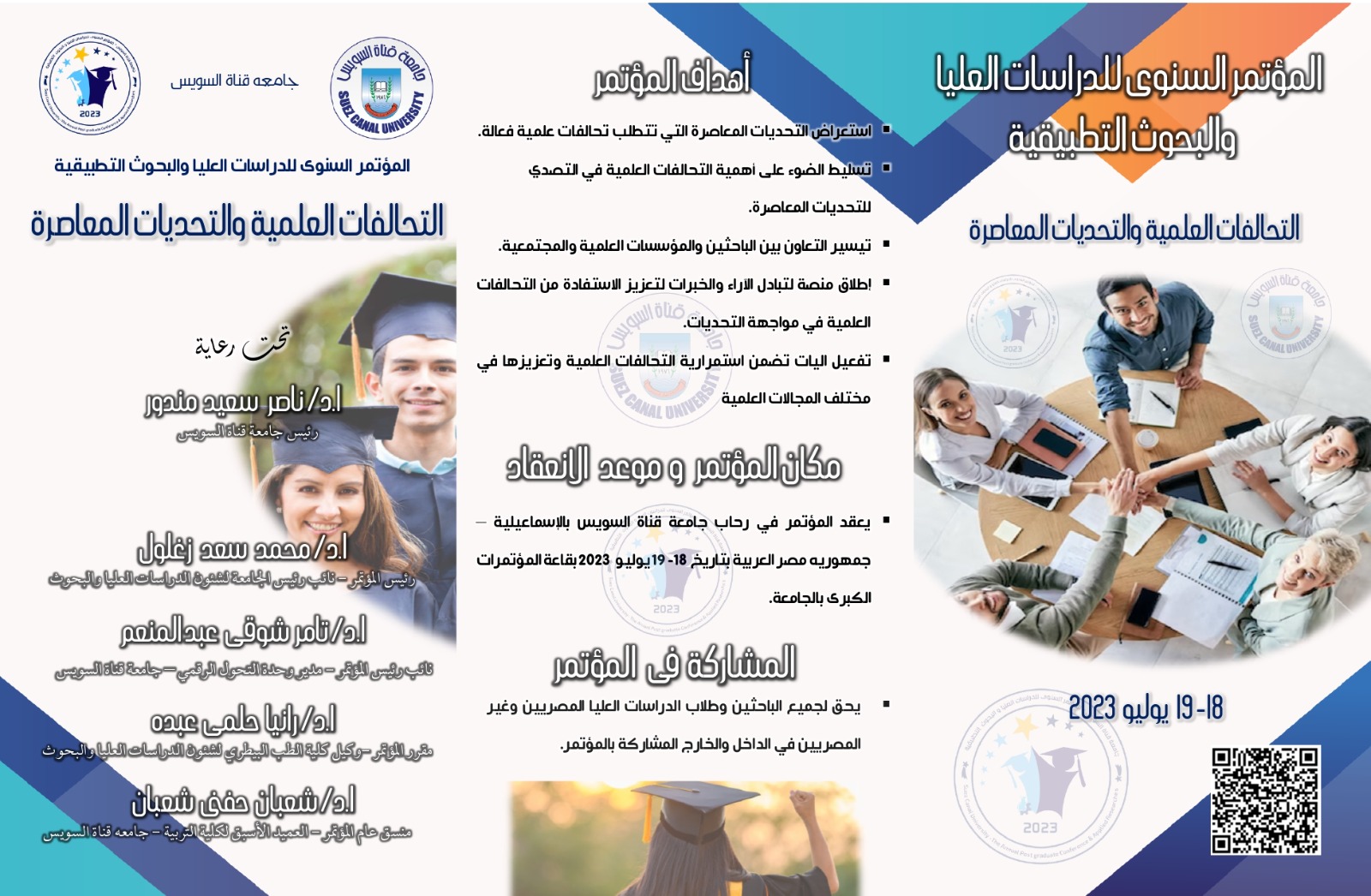 يعقد قطاع الدراسات العليا والبحوث جامعة قناة السويس، مؤتمره السنوي للدراسات العليا والبحوث التطبيقية يومي 18 و19 يوليو الجاري، بقاعة المؤتمرات الكبرى بالجامعة، بعنوان "التحالفات العلمية والتحديات المعاصرة"، وتحت رعاية الدكتور ناصر مندور رئيس جامعة قناة السويس، وبإشراف عام الدكتور محمد سعد زغلول نائب رئيس الجامعة لشئون الدراسات العليا.