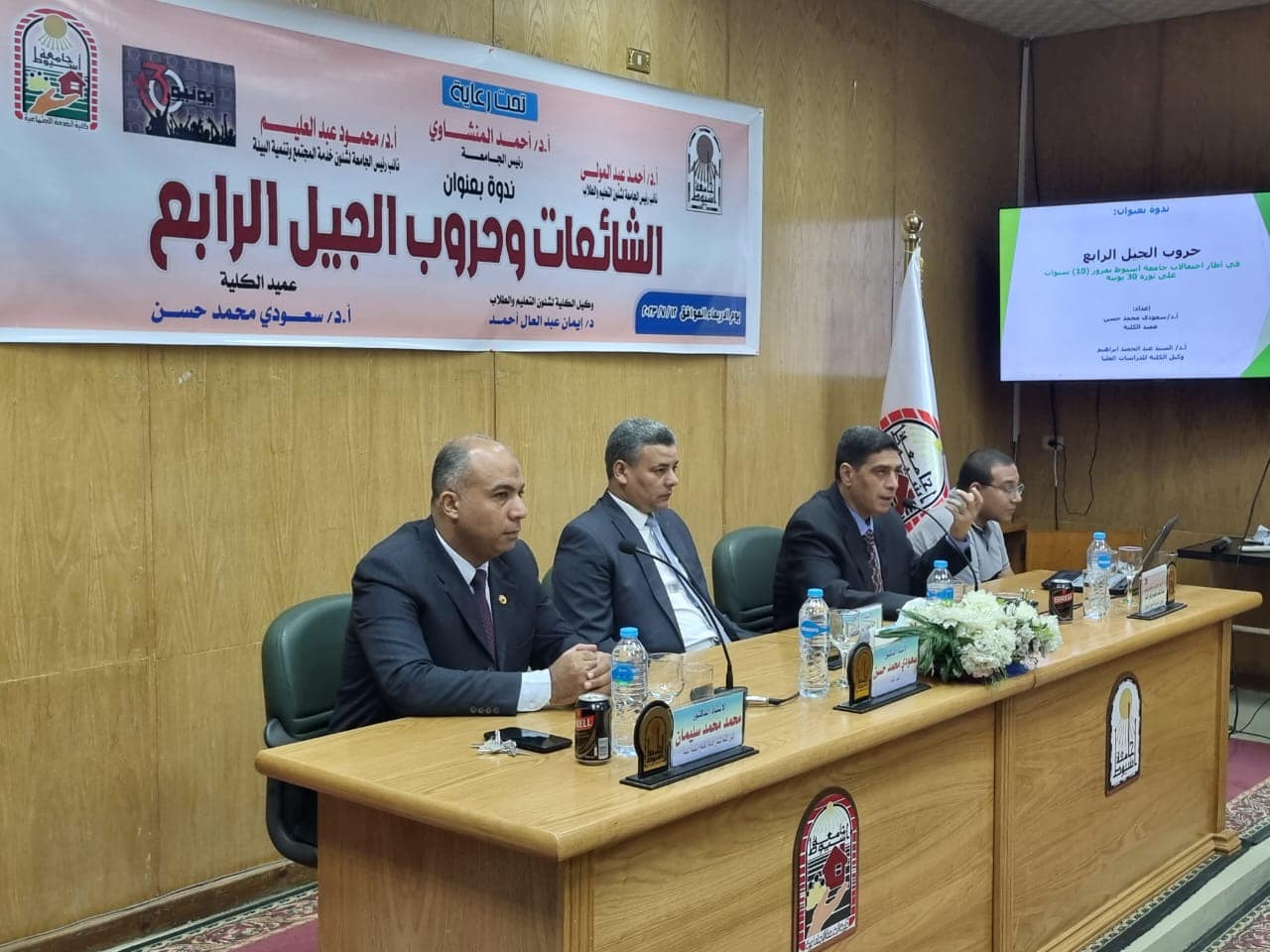 وتحدث في الندوة الدكتور السيد عبدالحميد وكيل الكلية للدراسات العليا والبحوث، عن حروب الجيل الرابع، أنواعها وخصائصها والنتائج المترتبة عليها، كما تحدث الدكتور محمد سليمان عن الشائعات، خاصةً الشائعات الإلكترونية؛ مفهومها وأشكالها وخصائصها وسرعة انتشارها في المجتمع وطرق وآليات مواجهة الشائعات.