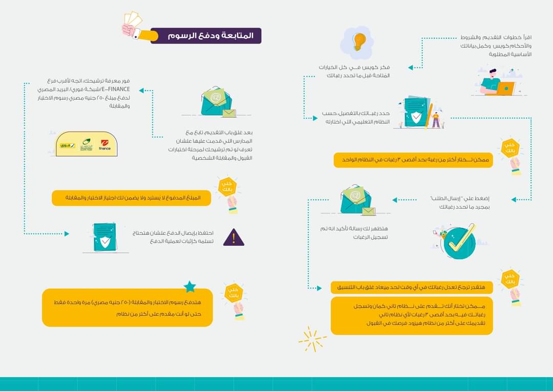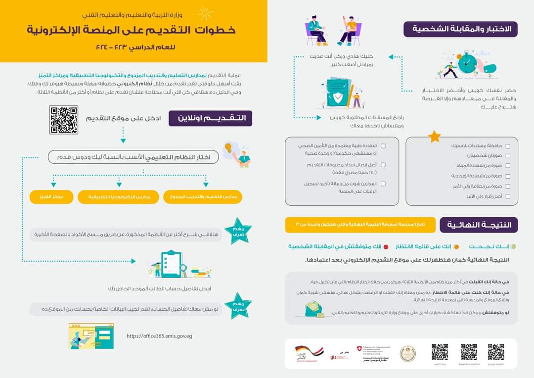 نشرت وزارة التربية والتعليم والتعليم الفني، رسم توضيحي يوضح طريقة تسجيل الرغبات للطلبة الحاصلين على الشهادة الإعدادية لمدارس التكنولوجيا التطبيقية والتعليم المزدوج ومراكز التميز.