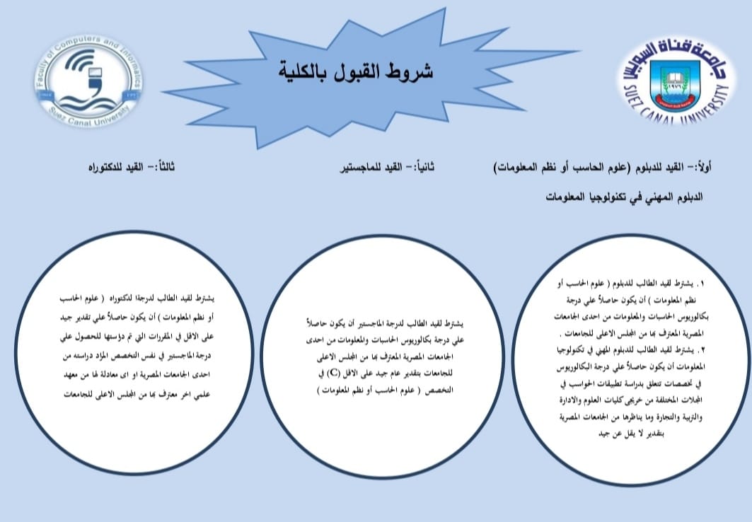 في حين أشار الدكتور محمد عبد النعيم نائب رئيس الجامعة لشئون التعليم والطلاب والمشرف على الكلية، أنه يشترط لقيد الطالب لدرجة الماجستير أن يكون حاصلًا على درجة بكالوريوس الحاسبات والمعلومات من إحدى الجامعات المصرية المعترف بها من المجلس الأعلى للجامعات بتقدير عام جيد على الأقل (C) في التخصص (علوم الحاسب أو نظم المعلومات).