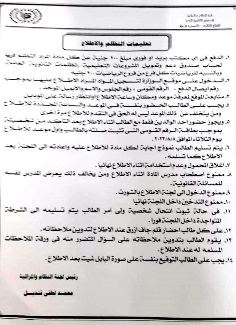 شددت الوزارة خلال خطابها أنه يجب على كل طالب إحضار قلم جاف أزرق لتدوين ملاحظاته وممنوع منعًا باتًا أصطحاب مدرس اللجنة بالاضافة إلى أنه ممنوع الحضور بالشورت.