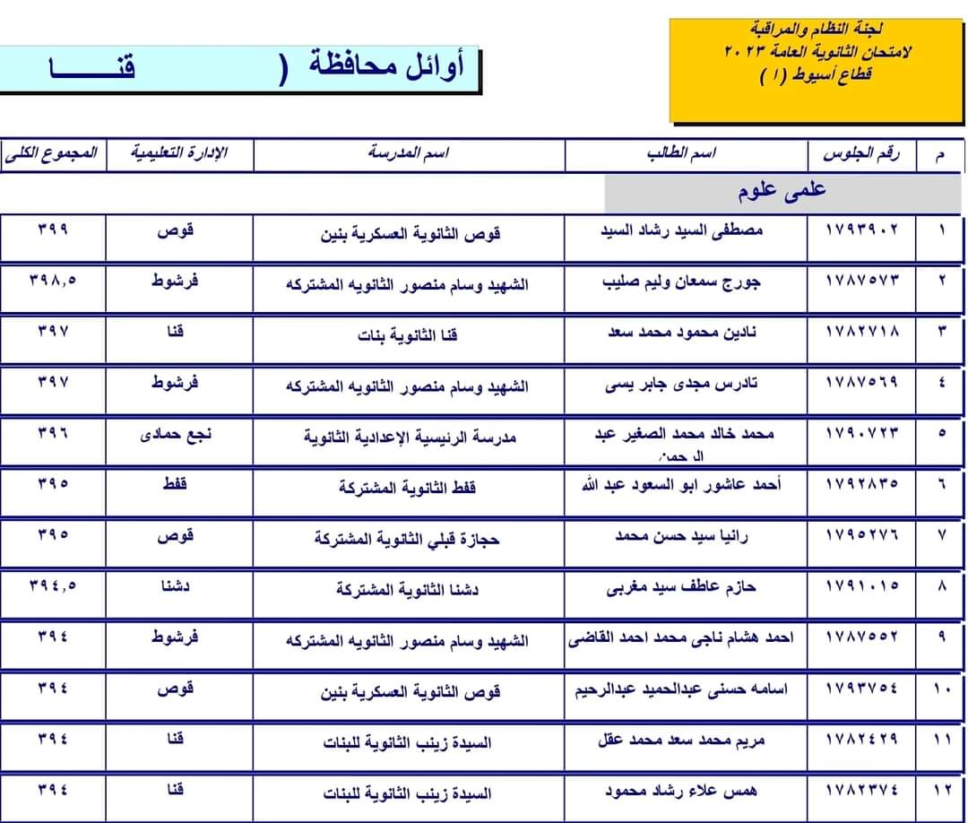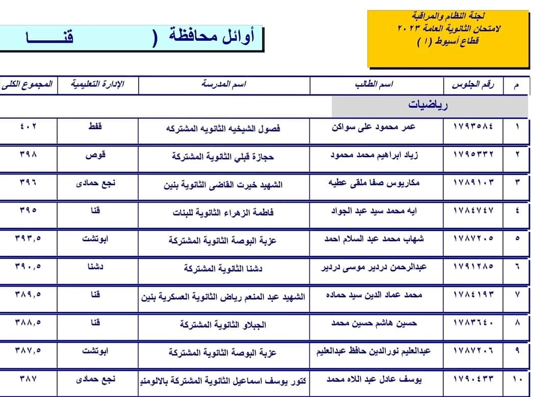 بالاسماء.. أوائل الثانوية العامة 2023 بقنا